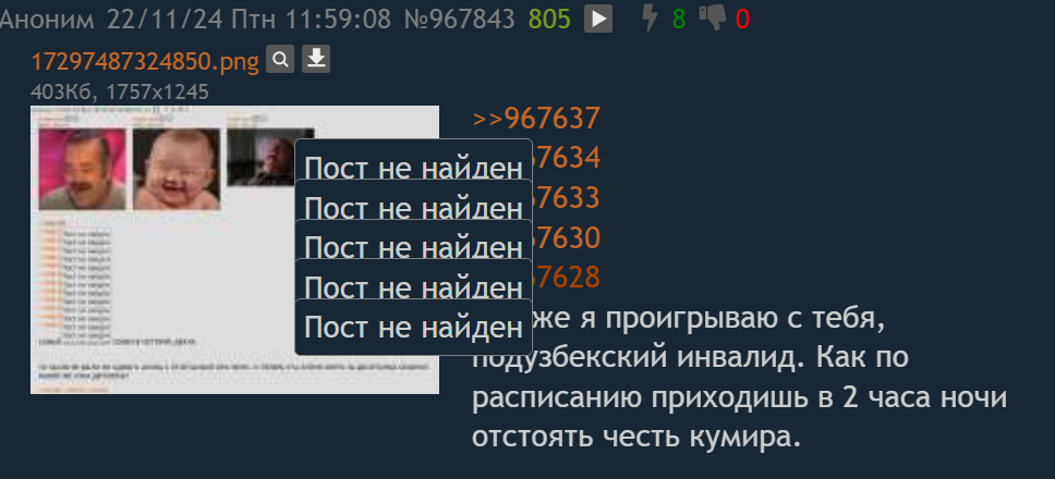 Всё, больше ничего подпедочурка придумать не смогла. Только шизу про "образ инцела", который узбек якобы хочет сохранить, когда все его действия говорят об обратном. Но подпедочурке похуй на факты, его задача просто срать и перефаршивать, перефаршивать и срать и в конце месяца он получит 2500 гривень от кумира.