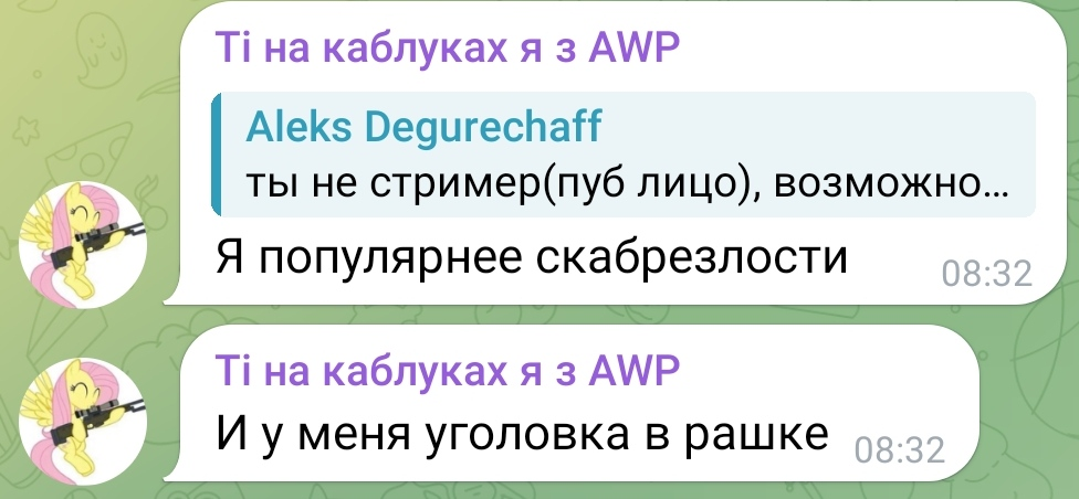Что уж говорить про визги Екала, которые слышно на стримах. Подпедочурка пытается форсить, что это его мать аргументами в стиле "и у старух бывает молодой голос". Подпедочурка долбится в уши, остальные же могут послушать голосовые Сраки и сравнить с визгами.
