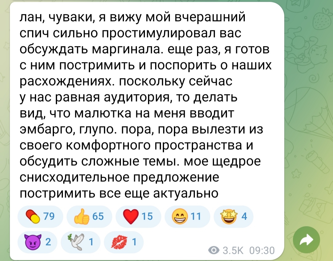Это мощный даунгрейд, Толь. Ты накопи нормально, поголодай там, и снова съезди к проститутке в Волгоград и наделай новых фоток. А то текстовые пуки в тг совсем жалко выглядят на фоне твоих предыдущих ирл шлохо-перформансов.