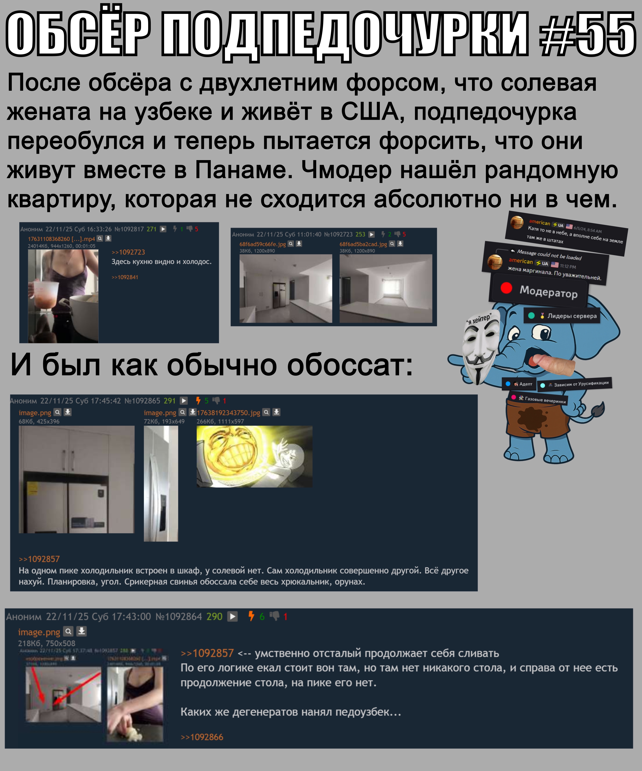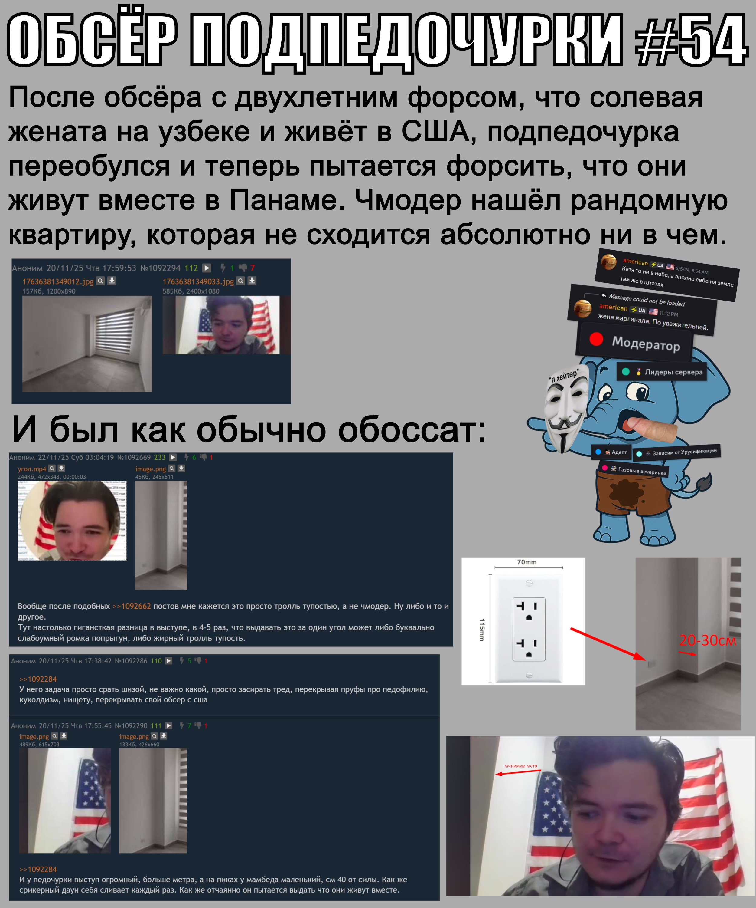Чурке не нравится, что в треде обсуждают его личную жизнь в виде екала, поэтому он нанял петуха-перефорсера, чтобы тот засирал тред имбецильными визгами в попытке перекрыть наличие жены у Чурека. Изначально имбецильный петух-перефорсер кукарекал, что все фотки/видео нейросеточные, но потом до хуеплёта дошло насколько нелепы его визги и он поменял методичку. Согласно новой методичке, Чурка на самом деле нищий и живёт с мамкой, но при этом задонатил $7к на дроны и платит шлюхе из Волгограда, чтобы она изображала его жену и скрыто форсила это в треде и через подсосов, таких как Каджит, который стримит на 5 человек (только вдумайтесь в этот тупой бред хуеплёта). Чурка заставляет екал покупать такую же одежду, клеить розетки американского стандарта на стену, который распространён в Панаме, подбирать такой же цвет стен как у него, фоткаться в американских магазинах и так далее. И всё это, чтобы скрыто форсить, что он не инцел. Долбоёб на подпедочурке решил, что это гораздо убедительней, чем визги про нейросеточные фотки. Подпедочурка скорей всего является инвалидом, потому что сторожит тред днями и ночами, особо активно начинает срать, когда в треде появляется очередной пруф, что екал живёт с чуркой.