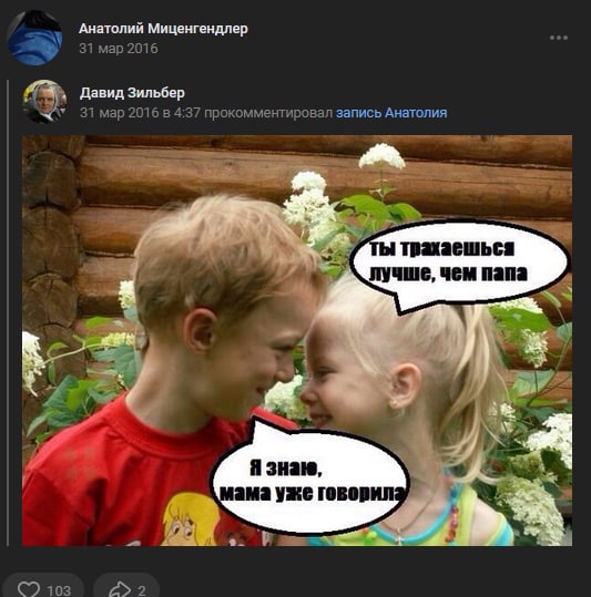 >>1121845 >>1121846 Короче в друзьях бабки еще много интересных людей. В форме. И дядя отчим дима есть, молодой и красивый для своих 39. Чмо толян в 33 года выглядит как говно, а тут мужчина эталонный прямо... Катюха до мозга костей конторская дама. А ты донать и воюй, тарасик, воюй, распадайся.