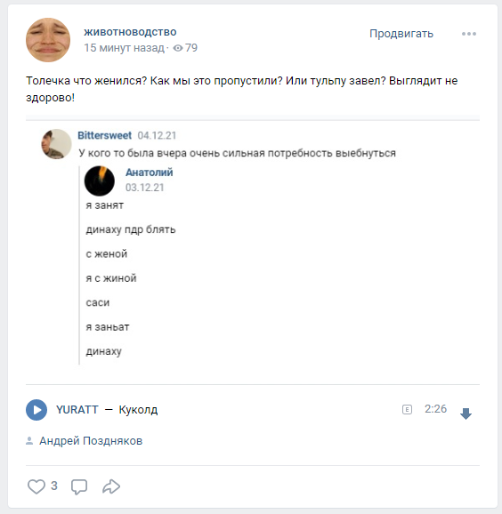 >>1121909 > сожительства с вонючей залупой,что подтверждено слитыми голосовыми Подпедочурка, где совместные фотки куколда с екал? Твой нахрюк про голосовухи не прокатит