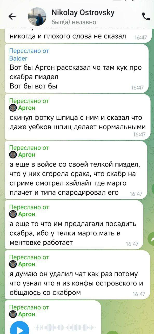 Посмотрим сегодня, как Скабрезлость прокомментирует ситуацию на стриме. До слива он намекал, что Срака называла его жирным, ватным и конторским. После слива он только написал вчера "Аргон, конечно, поражает. Трикстер, сын тзинча". Как уважающий себя гей Федя вроде бы крайне не любит, когда на него залупаются всякие прошмандовки. Интересно, воспользуется ли он возможностью пнуть хромую свинью и похайпить или затерпит, сглотнет и будет "не лезть в личную жизнь" бывшего педокумира.