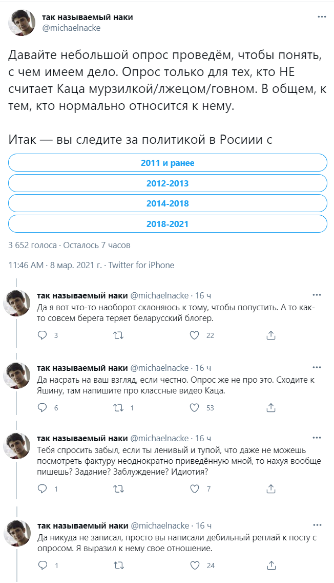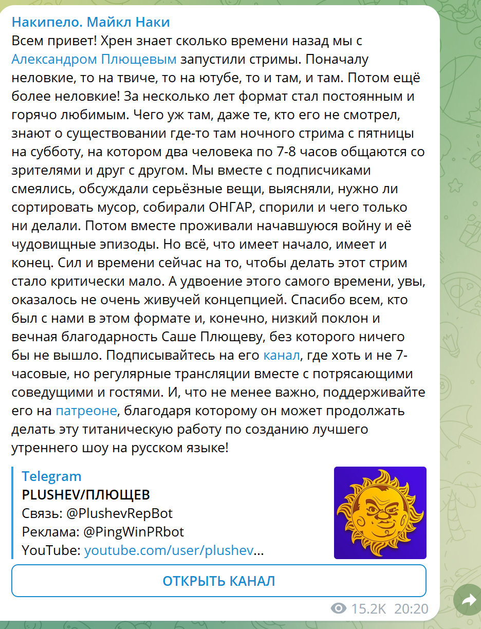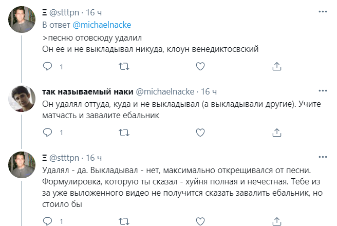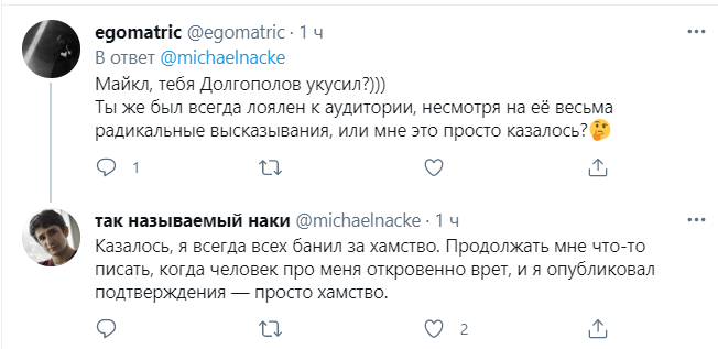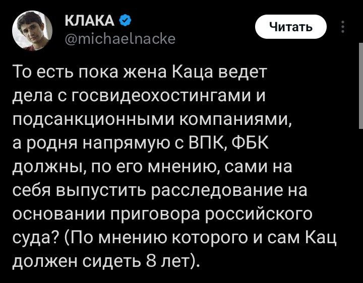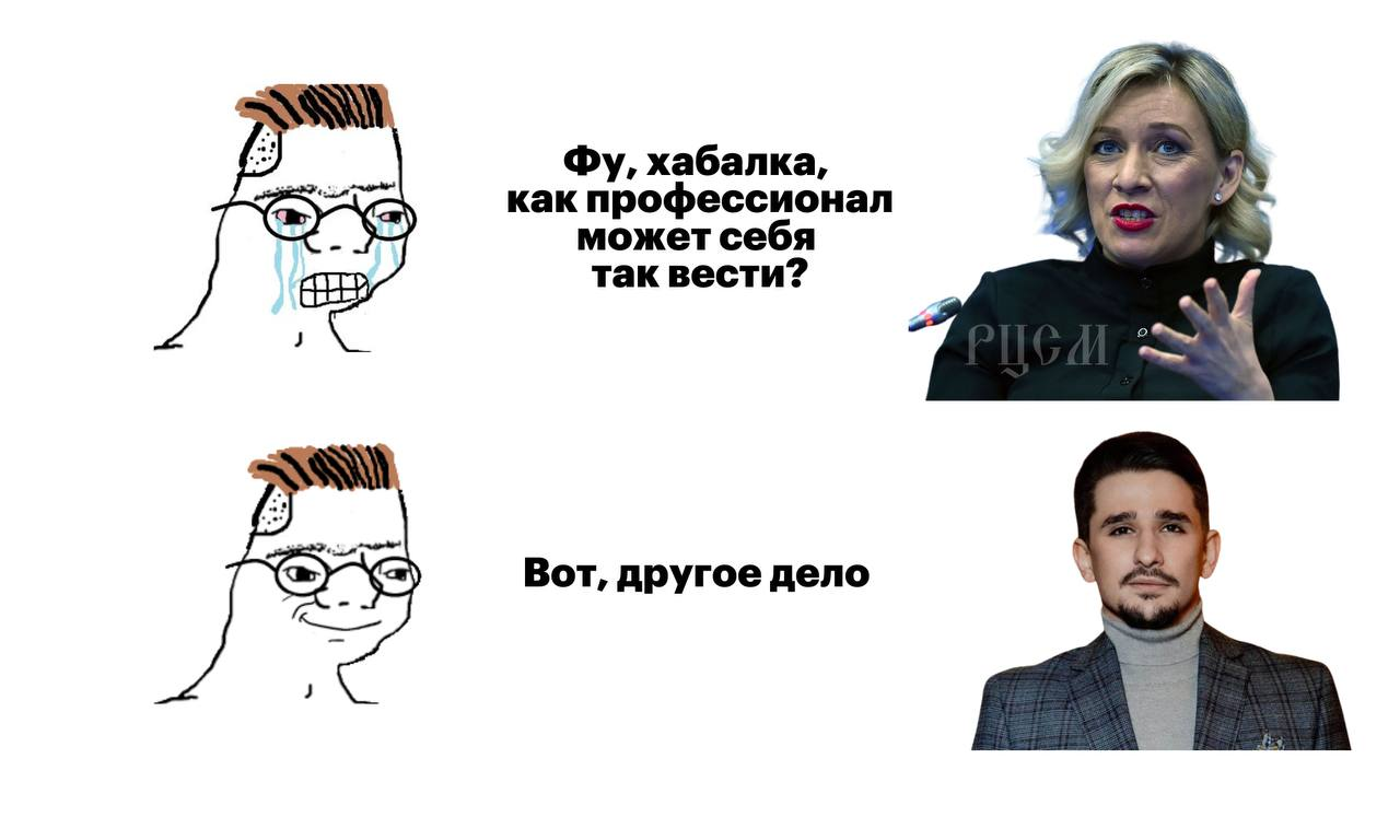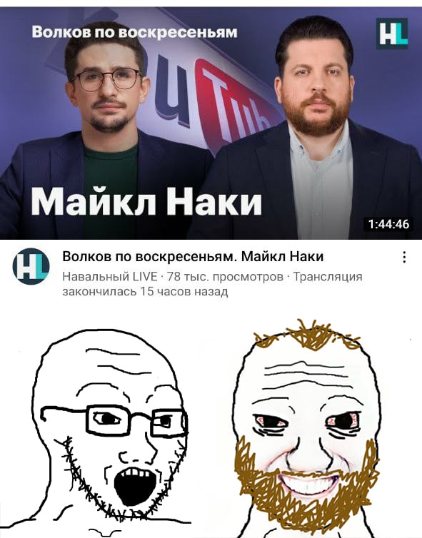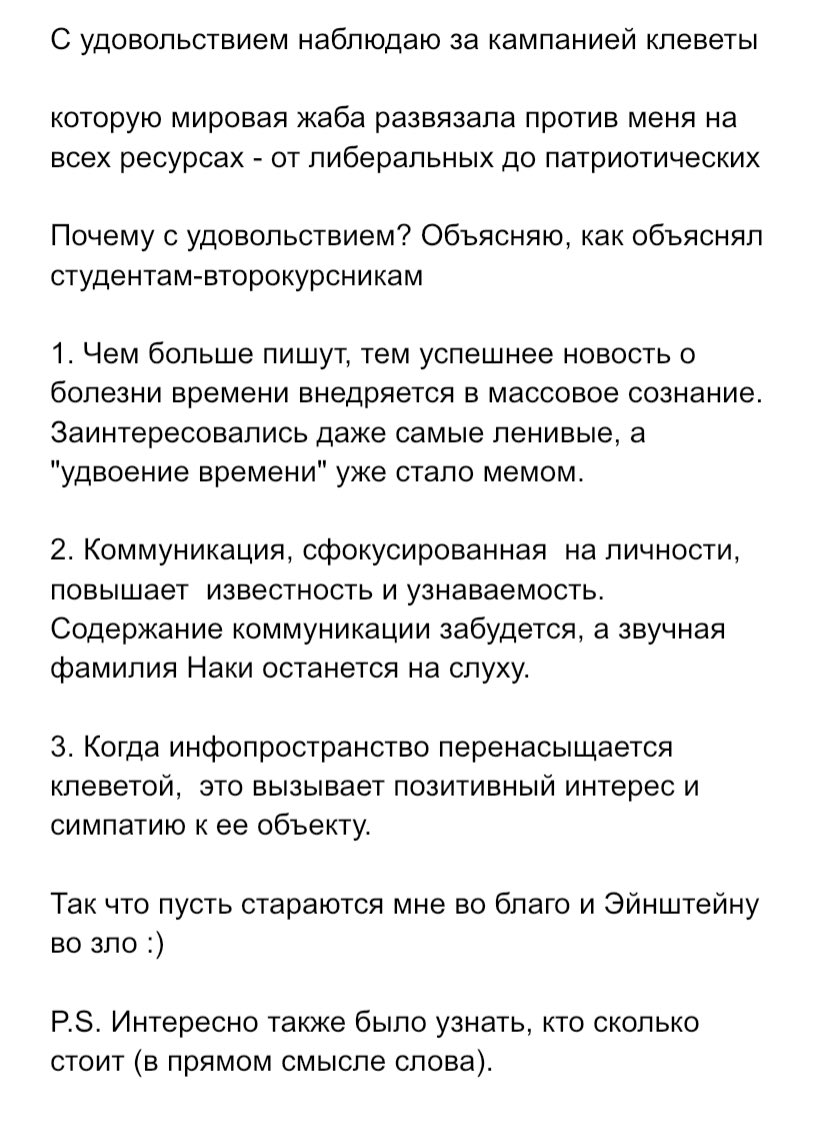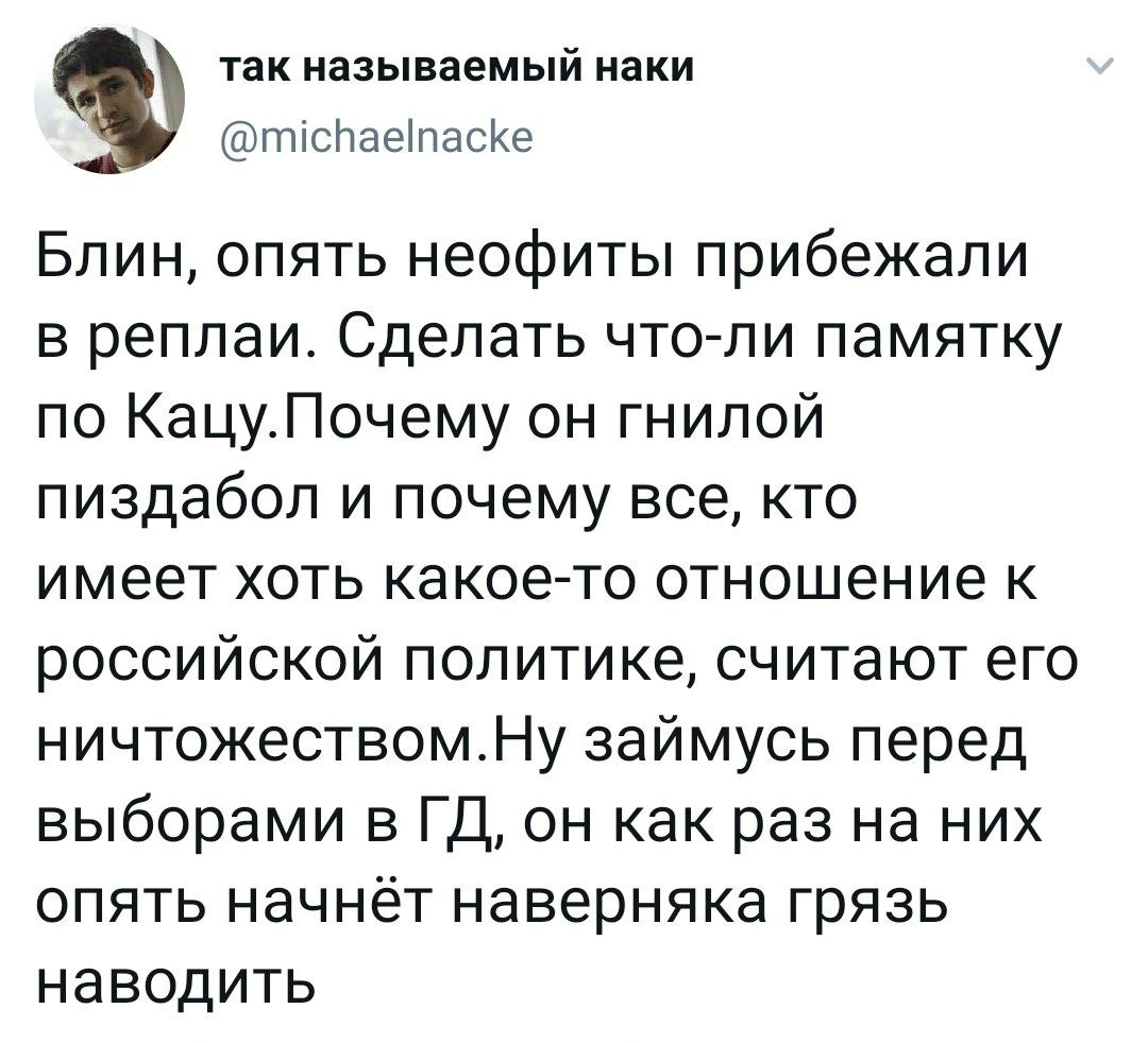 >>377473 Меня подорвало с другого - С его отношения к Кацу. Ещё весной он к Кацу относился хорошо, обсуждал его ролики про корону и прочее, даже модерировал дебаты Каца с Навальным. И не смотря на старый конфликт Каца с Плющевым - все время уговаривал Плюшева посмотреть Каца. Потом у Наки с Кацем произошёл какой-то денежный конфликт - два (((ведущих))) не поделили деньги И с тех пор начал уничижительно отзываться не только о Каце - это я бы понял: считаешь его жуликом - твое право. Но Наки начал пиздеть, что и ролики Каца говно, что там все неправда, что Кац врёт в своих роликах. Блять, вот как так? Это же самое настоящее переобувание в духе Соловьева