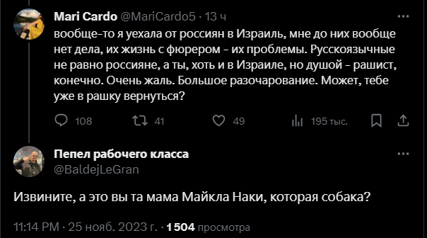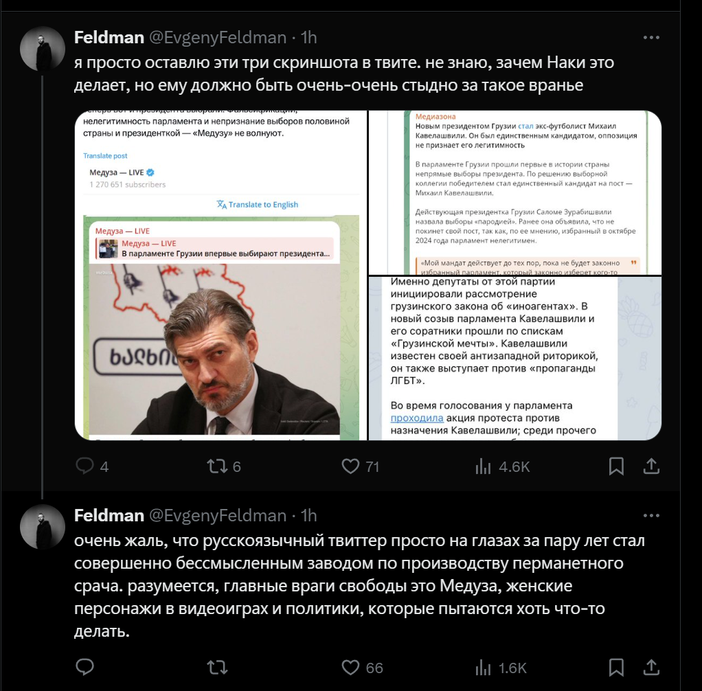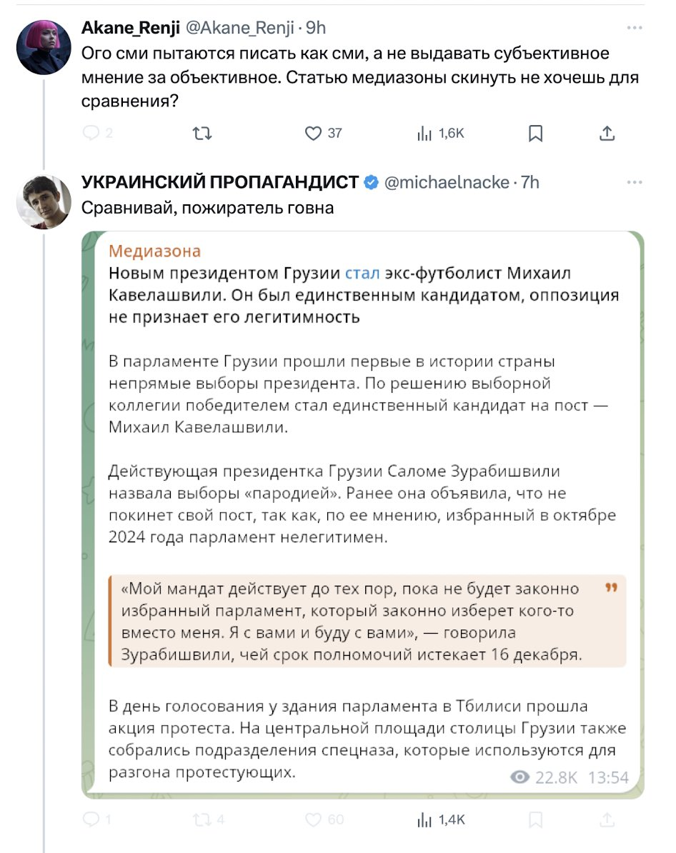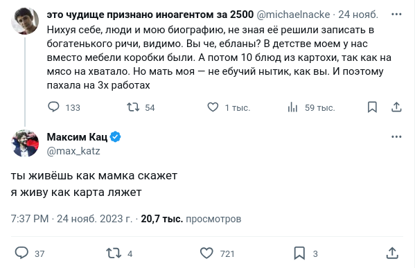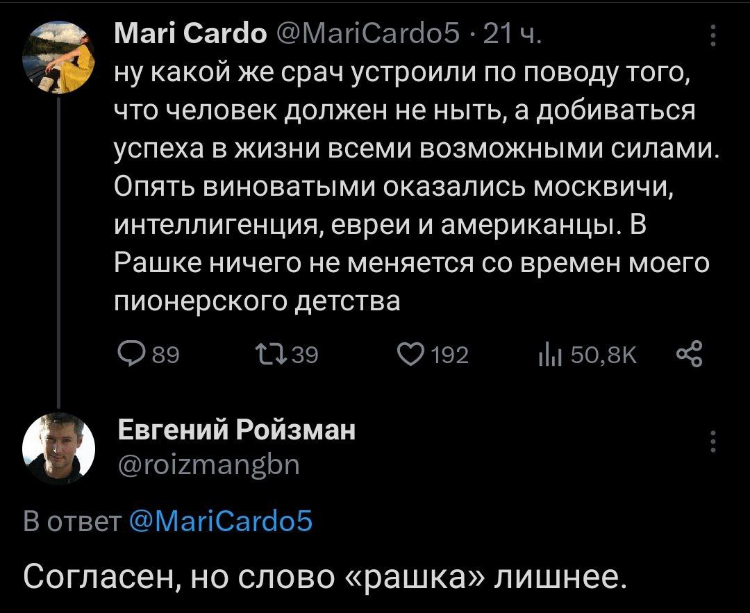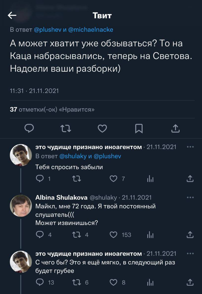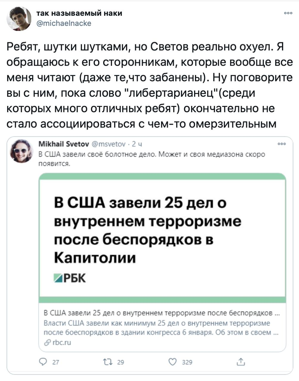 >>377473 Меня подорвало с другого - С его отношения к Кацу. Ещё весной он к Кацу относился хорошо, обсуждал его ролики про корону и прочее, даже модерировал дебаты Каца с Навальным. И не смотря на старый конфликт Каца с Плющевым - все время уговаривал Плюшева посмотреть Каца. Потом у Наки с Кацем произошёл какой-то денежный конфликт - два (((ведущих))) не поделили деньги И с тех пор начал уничижительно отзываться не только о Каце - это я бы понял: считаешь его жуликом - твое право. Но Наки начал пиздеть, что и ролики Каца говно, что там все неправда, что Кац врёт в своих роликах. Блять, вот как так? Это же самое настоящее переобувание в духе Соловьева