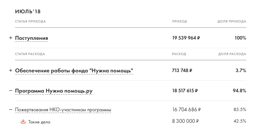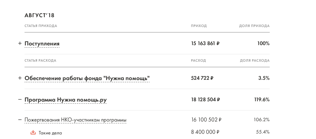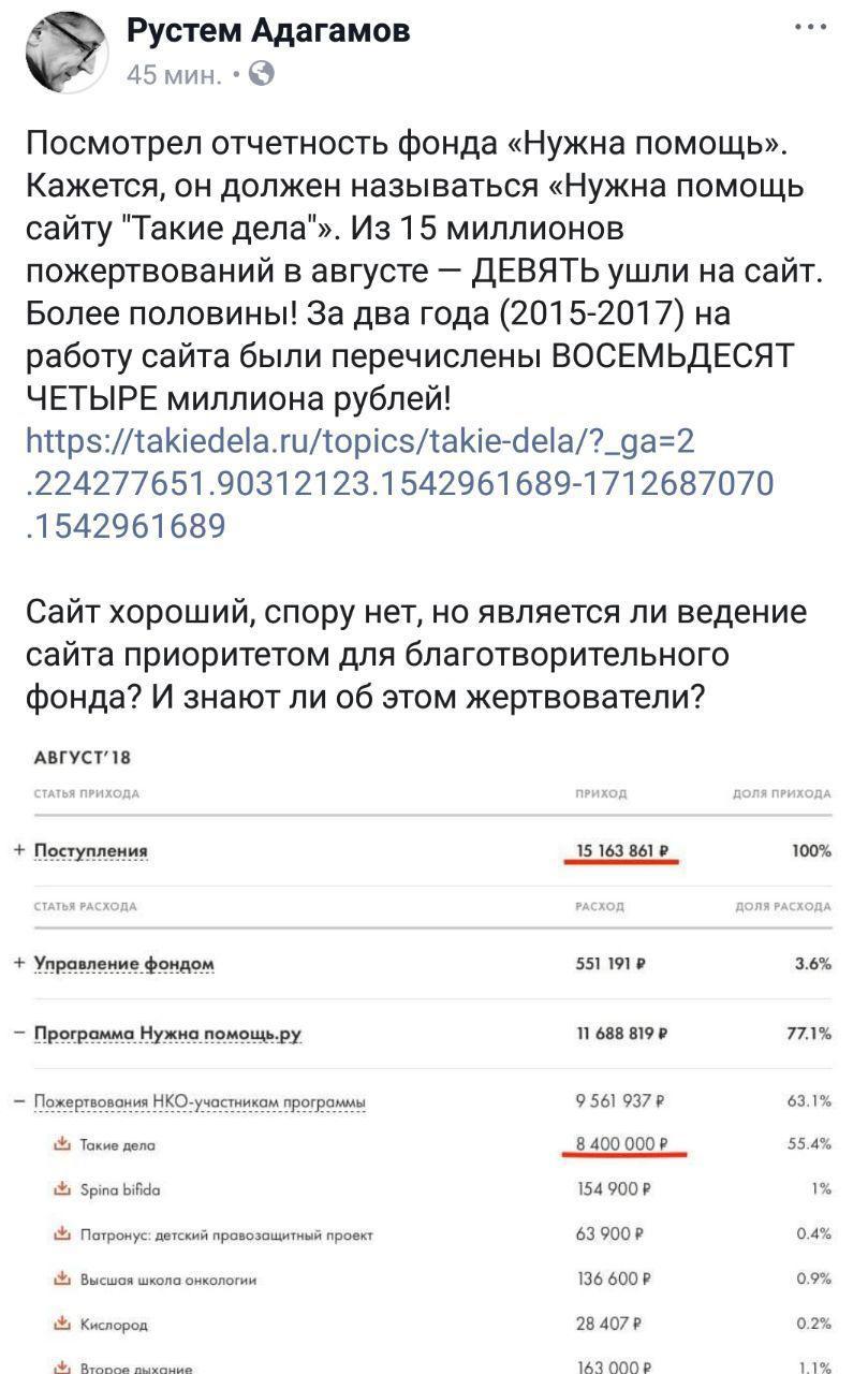 >>378111 Пиздеж Адагамова рассчитан на тех, кто вообще не в курсе ситуации. "Такие дела" это не благотворительный фонд в прямом смысле этого слова, а информационное медиа, которое помимо прочего собирается сбором для других благотворительных фондов. И те деньги, которые они себе берут - это не деньги, которые люди тратят на благотворительность, как пытается представить Рустем. Они собирают донаты отдельно на "Такие дела", и отдельно на конкретные благотворительные фонды, которым они помогают. Многие креаклы донатят именно "Таким делам", а не их благотворительной программе, точно так же, как донатят другим независимым проектам - Медиазоне, Дождю, ФБК и т. д. При этом благотворительная программа "Нужна помощь", если не брать конкретный УДОБНЫЙ месяц, а посмотреть общую статистику за три года, собрала в 3 раза больше, чем "Такие дела".