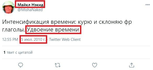 > ничего Майкл нового не придумал А как же это? >Является автором теории удвоенного времени, впервые выдвинутой им во время одной из прямых трансляций.[3] Концепция теории заключается в удвоении потерянного времени во время простоя. Для доказательства данной гипотезы был приведен мыслительный эксперимент с моделью автомобиля, который во время передвижения из пункта А в пункт Б совершает остановку. Согласно теории, автомобиль во время простаивания «теряет» время t, которое он стоит, а также дополнительное время τ, во время которого он мог совершать перемещение. Таким образом, поскольку t = τ, то, согласно гипотезе, суммарное время, потерянное автомобилем во время простоя - 2t, а не t, что и является «удвоением времени». Научным сообществом данная теория была встречена скептически