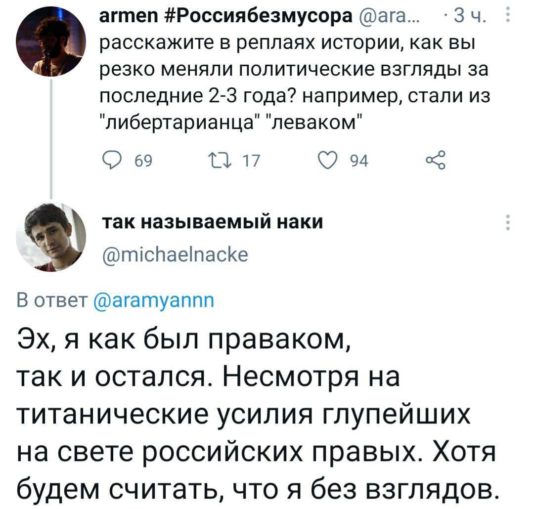 >>445425 Месяц назад: Никаких праваков и леваков не существует, поэтому я не левак. Сейчас: Я правак, поэтому я не левак. Продолжает придумывать всё новые и новые оправдания, чтобы защитить себя от осознания очевидного факта, лол.