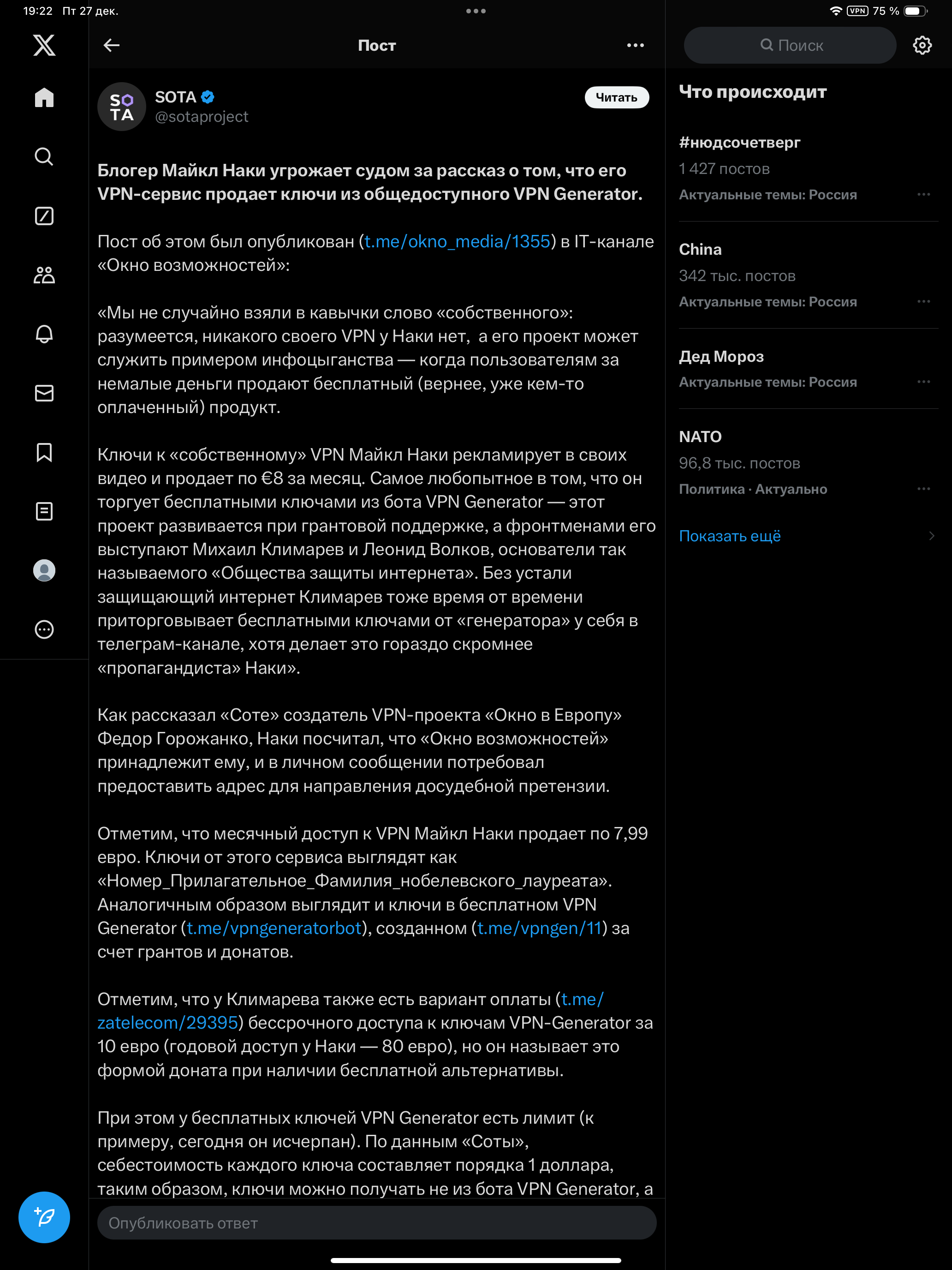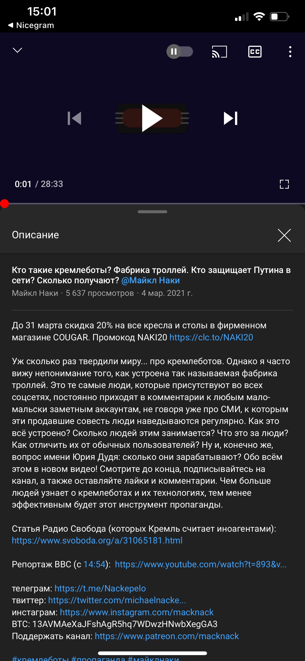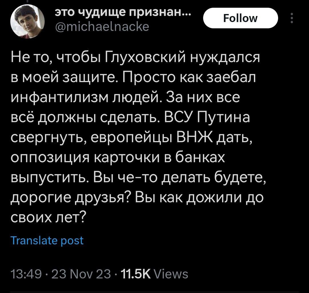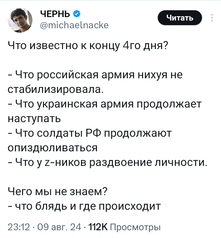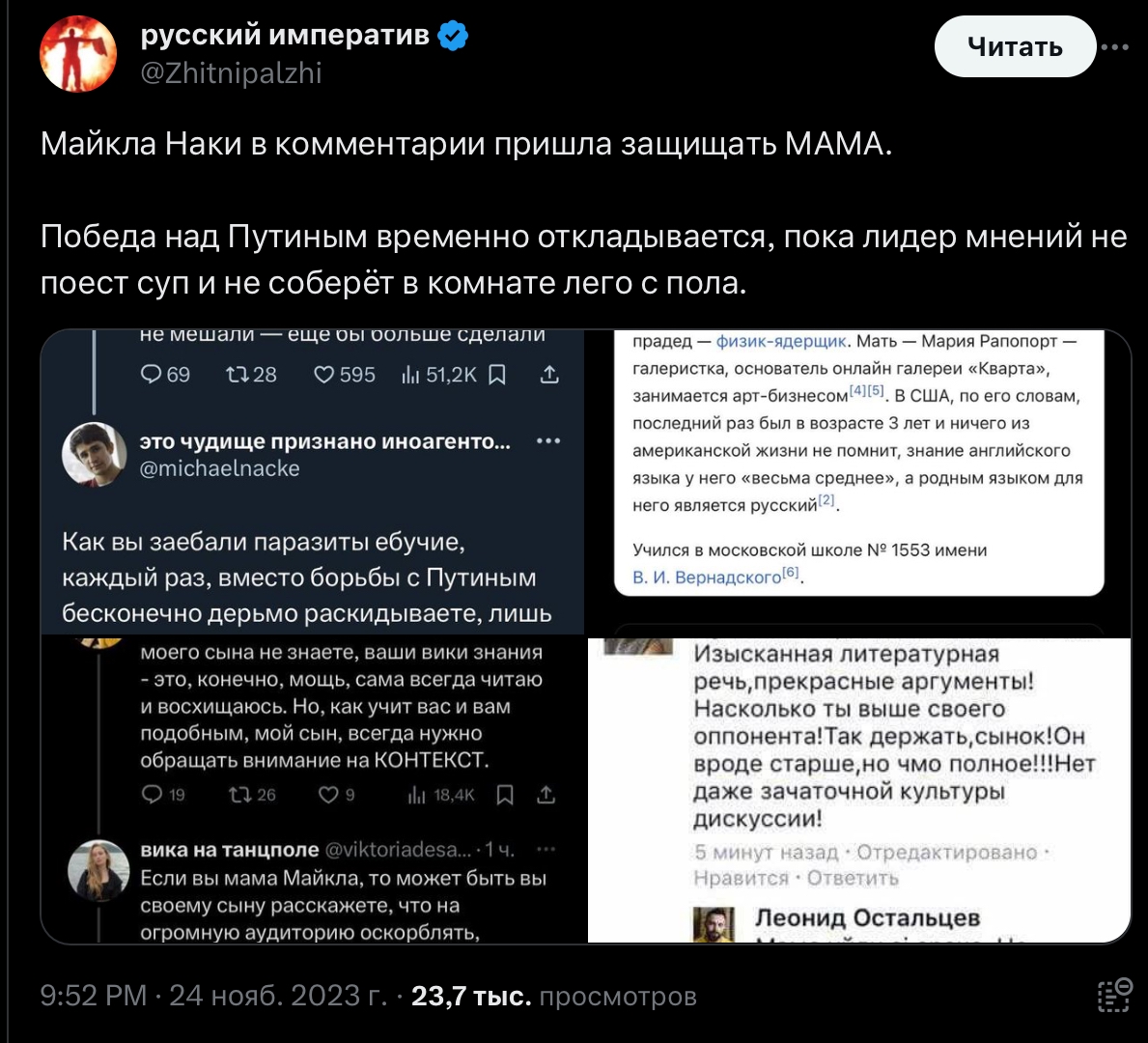 >>944100 Не могу осмыслить, как это "НАки скучно смотреть", ведь каждый раз душа радуется, как он тралит очередную z-гниду, и выдаёт довольно беспристрастный (уж, получше, чем у остальных) анализ ситуации, при это, постоянно, ПОСТОЯННО подчёркиваю, что мегаособым экспертом в некоторых темах не является, а делает выводы на основе своего опыта (довольно большого, кстати). Неоднократно говорил, что как только закончится война и станет нечего толком обсуждать, он или закроет канал, или оставит его как "архив", и пойдёт трогать траву, и в это, в принципе, верится. Поэтому не понимаю каких-то особых претензий к нему, ну если только вам лично прям что-то только не нравится.