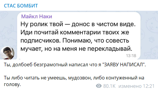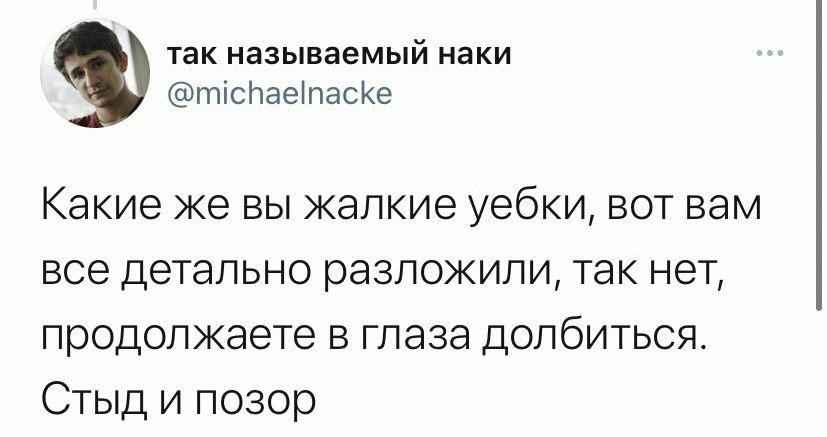 Наки ещё, как я смотрю, везде говорит, что у него чистейшая репутация и у него нет никаких зашкваров. А какие зашквары у тебя могут быть? Ты просто говорящая голова, не озвучившая за жизнь ни одной свежей или интересной мысли. Просто ебаный бессмысленный ретранслятор новостей. Пидорас ебучий, мать твою ебал