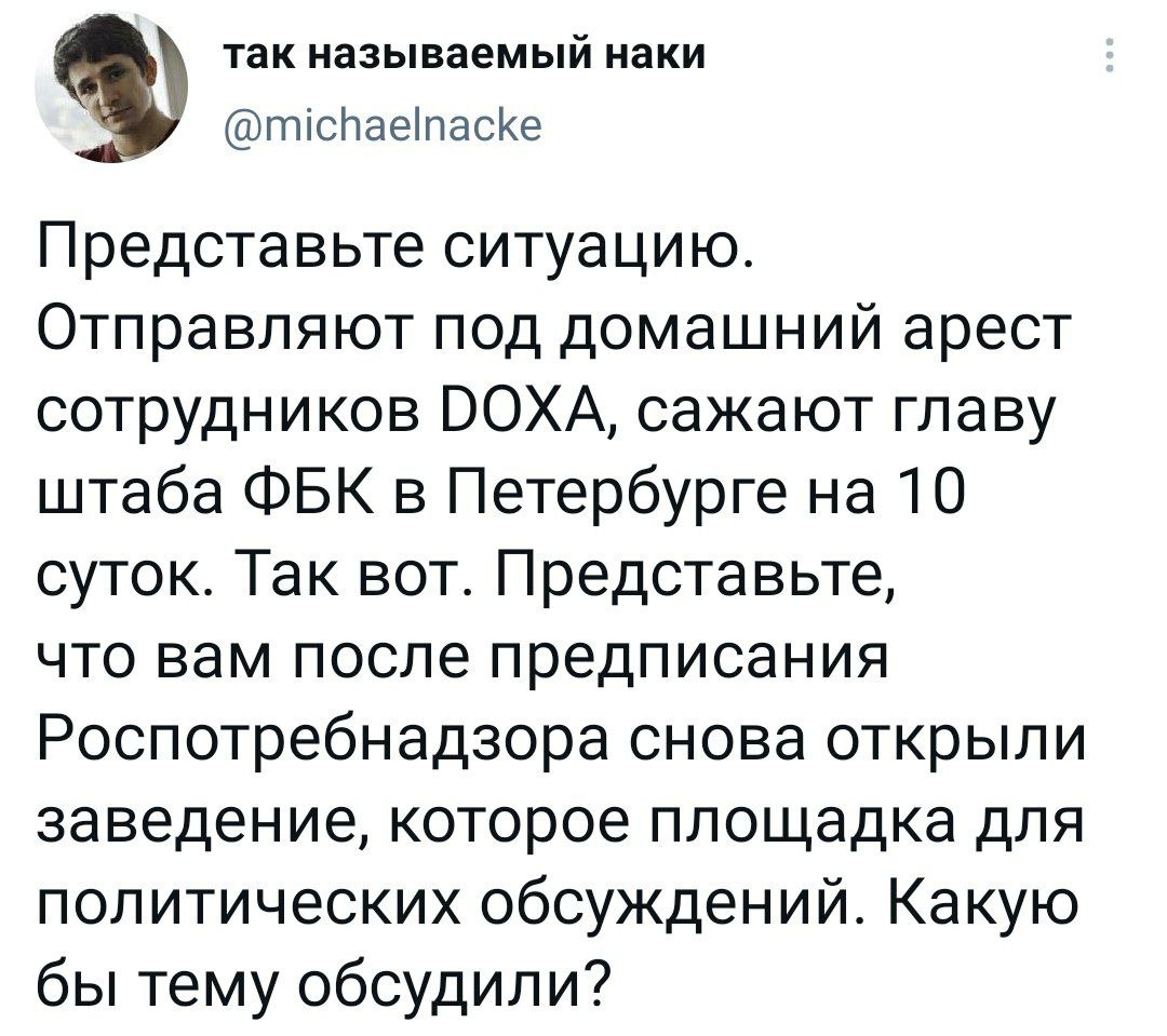 >>428581 По логике Наки - да. Он буквально месяц назад говорил что-то типа "Вот к оппозиционернейм приходит полиция, а Светов открывает ресторан в центре Москвы. Делайте выводы сами".