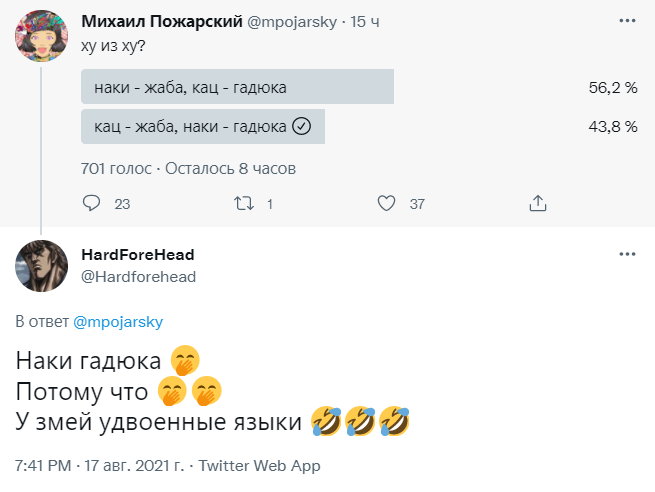 >>385555 >Неа, поначала это было забавно и у Наки даже заметно подгорало Он сам его форсил на протяжении почти года, упоминая чуть ли не в каждом своем стриме и выдавая всякие унылые шуточки в твиттере, просто эта хуйня долго не взлетала и взлетела всего несколько месяцев назад после стрима с Маргиналом, когда вся эта шобла-ебла начала форсить протухший пережеванный недомем и сделала за него то, что он пытался сделать всё это время самостоятельно. Он наглый хайпожор типа Соболева, которому похуй на идеи, принципы, репутацию, главное личные профиты и привлечение внимания.