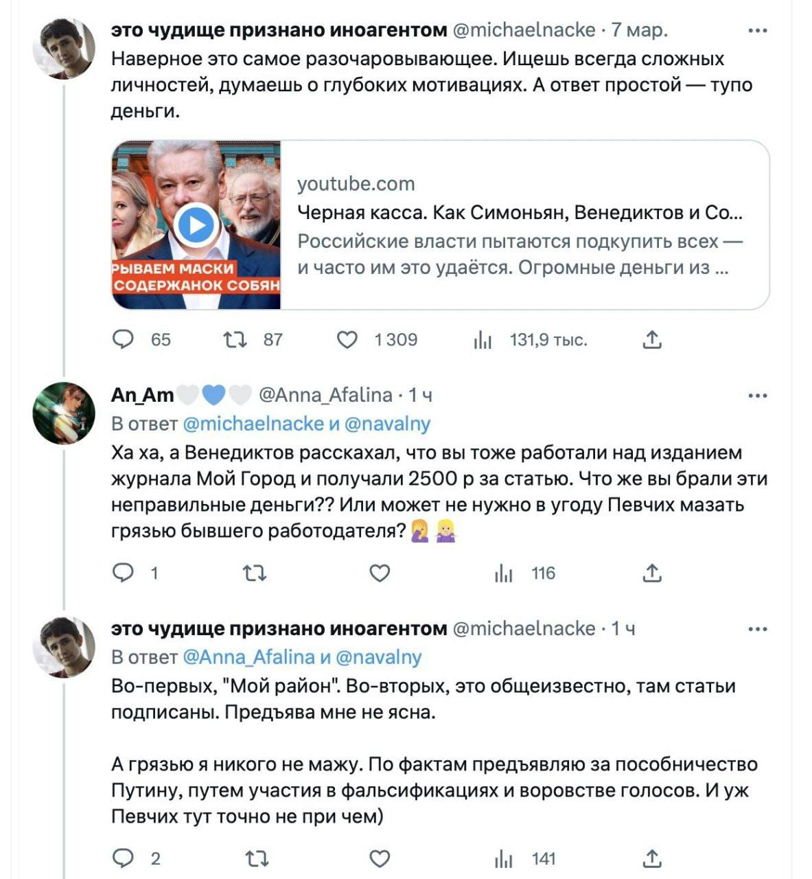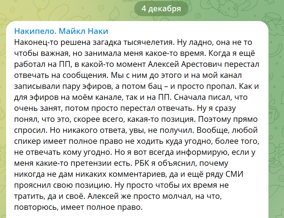 >>389204 Двачую. Это в корне поменяло мое отношение к Наки, раньше хотя бы иногда слушал его с интересом, теперь не могу всерьез воспринимать. Знаете почему он его нахваливал и облизывал? Он после ухода с Эха собирался пойти в Городские проекты Варламова, где Кац является руководителем. В течение всего процесса переговоров он превозносил Каца как героя и лучшего блогера Ютуба, потом внезапно что-то не склеилось и стало понятно, что Кац не очень в нем заинтересован, и внезапно Наки начал рассказывать абсолютно противоположные вещи и про Каца, и про его проекты. Сейчас он с такой же активностью вылизывает Навального, Низовцева и ФБК в целом - видимо, рассчитывает на предложение работы в журналистском штате штаба Навального.