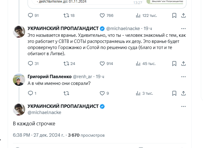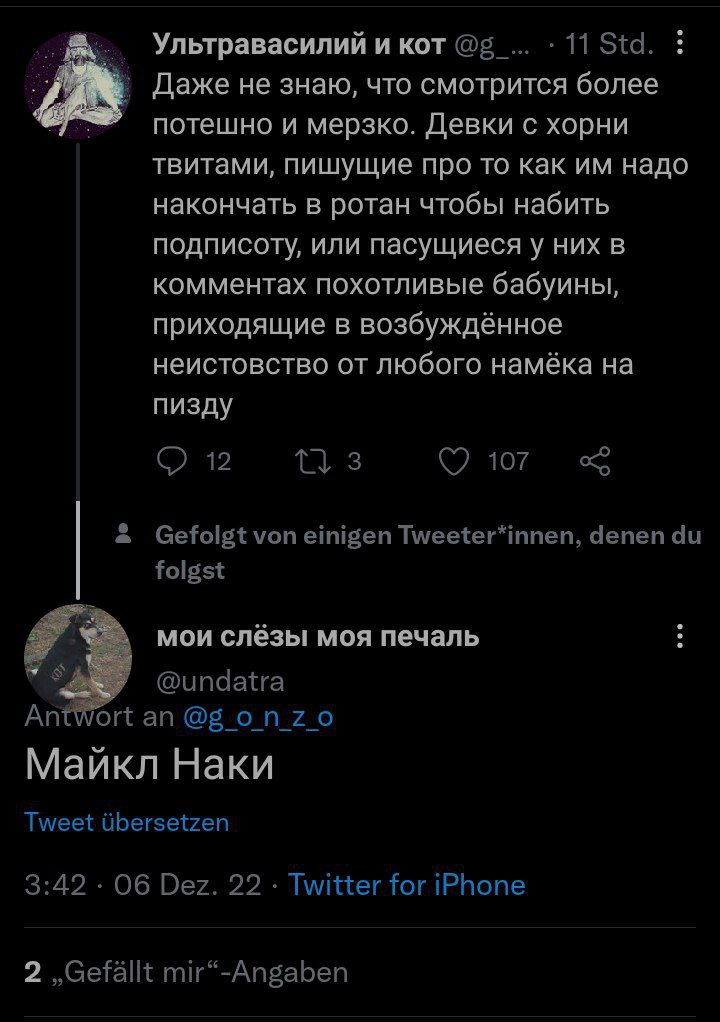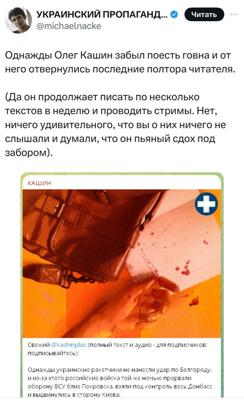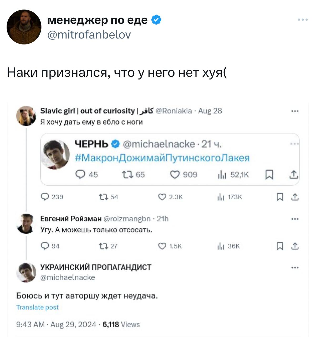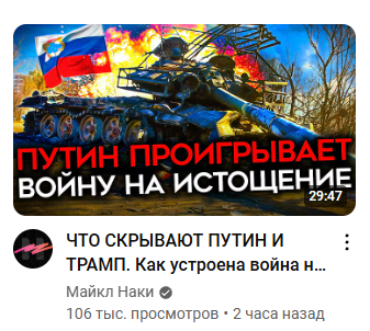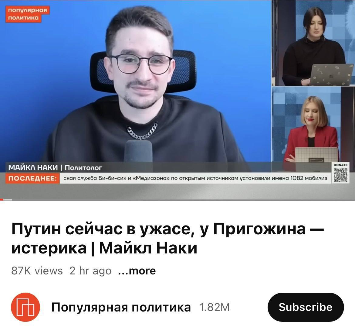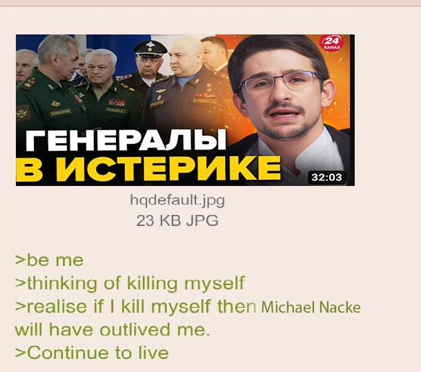 Майкл Наки это тот у которого каждое видео про то как ВСУ побеждает а ВС РФ вечно проигрывает при любом раскладе. Он несёт такую оторванную от реальности хуету что даже хохлы ему не верят. Ему там про Геббельса пишут под каждым видео, потому что в каждом видео он пиздит так сильно и так впаривает что Путину вот вот конец и РФ проиграет уже завтра что его закономерно сравнивают с Геббельсом у которого красная армия в Берлине означала победу и конец СССР ибо Гитлер должен был отбросить их до Москвы за один день. Я просто в шоке с того как кто-то может не верить в тупейшую пропаганду за деньги, ведь Майкл Наки это живое доказательство пропаганды, при чём такой тупой и наивной что в неё поверят лишь детсадовцы, самое смешное что он ему платят копейки а он так выкладывается и извивается клепая пачками новые видео с тупой ложью в которую никто не поверит. За этим очень забавно наблюдать.