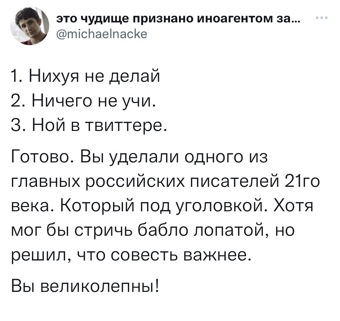Как же Майкл бесстрашно сражается с кровавым режимом Каца... Как ни зайду в его твиттер, постоянно вижу стену постов про него. Капец Майкл смелый конечно, это вам не против Путина протестовать, это УРОВЕНЬ.