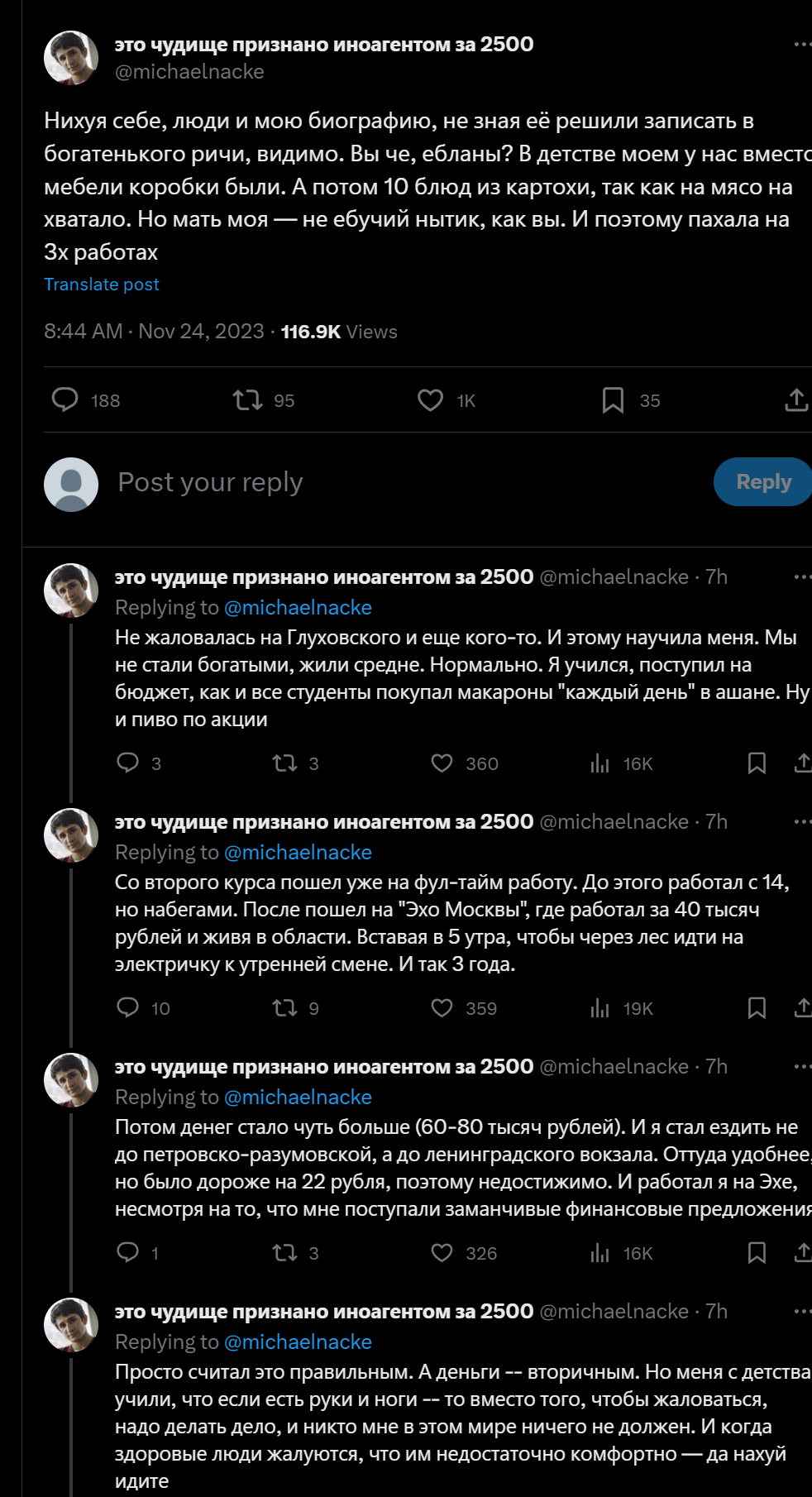 >>378065 Ну есть в рахе некоторая поляна хм прогрессивной общественности. Старперы - классическая демшиза, в принципе свое отжили. Новые - что-то типа плохой каргокопии условного американского среднего класса, по поведению, не по доходам. Всякие люди творческих профессий, айтитусовочка, паразиты не велфере в той или иной форме (донаты, собственный благфонд, журналисты слышь, донать на наше квир сми 500 тыщ в месяц), люди с сомнительным происхождением средств. Вот у них принято попивать смузи, барнаулить, клеймить пыньку/харасмент/нелеваков/ в свиттере и смотреть ютюбчики всяких говорящих голов капец какой он умный надо оформить ежемесячное пожертвование. Причем клеймя пыневиков за коррупцию они не могут даже какой-то моральный (я даже не о финансовом) аудит своих кумиров провести. Вот и собирают говорящие головы, фейковые благотворительные фонды, городские проекты и прочая срань денежки, которые идут на содержание либеральной номенклатуры. И доходит до смешного. Кац собирал по 8 тыщ рублей на перевод одной статьи по коронавирусу на 2 страницы а4 ставка профессионального переводчика рублей 400 страница максимум, варламов собирает по 700 тыщ в месяц на проекты уровня мы нарисовали картинку в фотошопе как должен выглядеть переход в новых залупках. Алешковский тратит по 40 млн рулей в год на содержание сайта блять. И так далее. Но дебилы не переводятся и продолжают донатить.