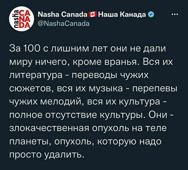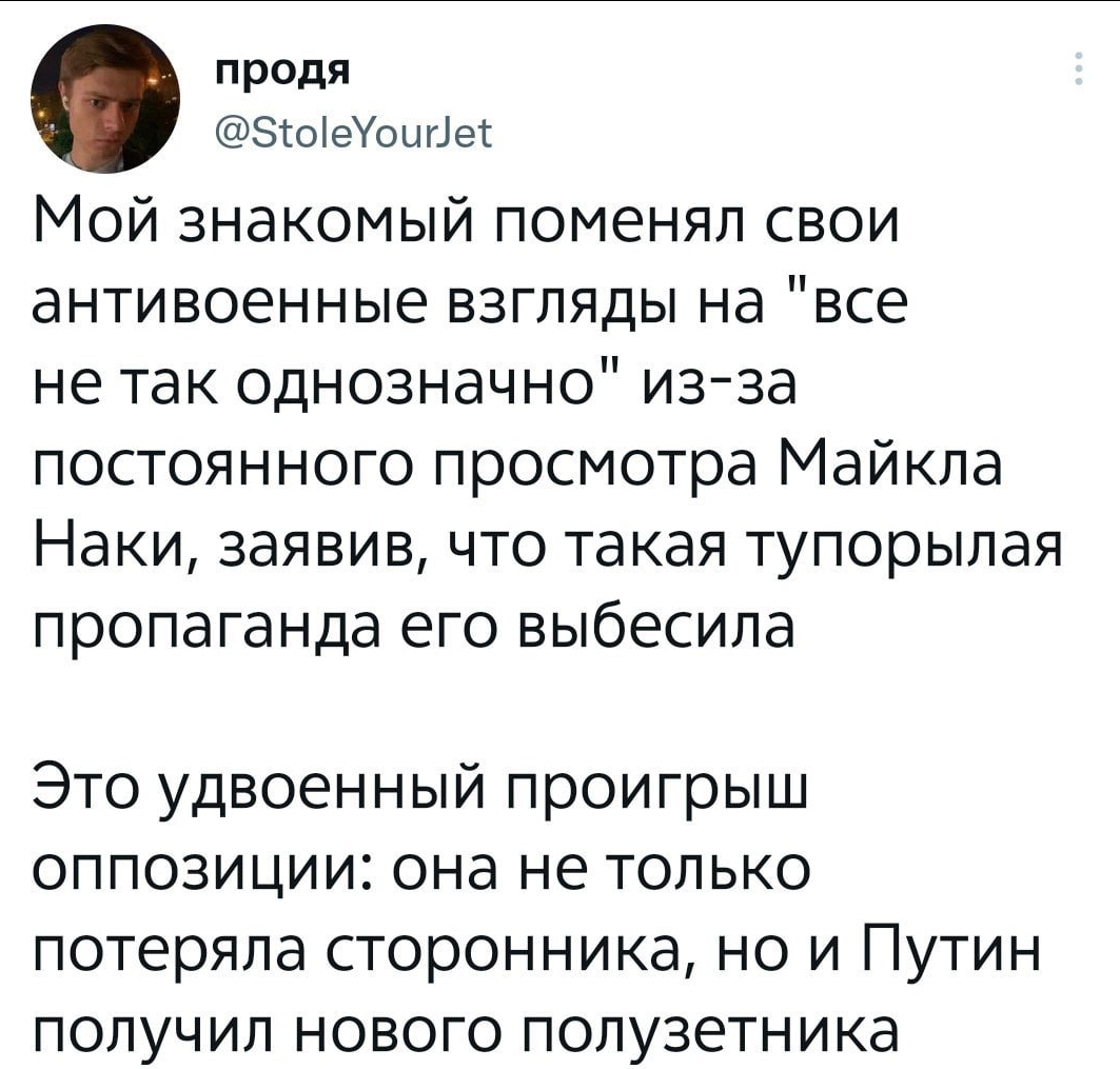 >>459831 C путиным всем здравомыслящим всё понятно, что вообще можно по нему добавить, а Наки врядли смотрят или слушают какие-нибудь бабки из отрядов путина, которых можно еще переубедить, это крайнемаловероятно, а вот ублюдки-зумерки, либертарианцы, плюмовцы и прочий скам, которые в жизни не работали, но рассказывают как нам жить и как нам обустроить россию, которые внезапно ебанулись, после того как им сказали что православие, монархизм, "аниме-консерватизм" sic! борьба с вакцинами, "новиопами", правами человека и социальными гарантиями, борьба c "западным либеральным\левацким истеблишментом" это круто, модно, молодежно - это реальная проблема российской политический и оппозиционной интернет-среды, деградация, являющаяся экзистенциальной угрозой для общего дела. Макнак всё делает правильно.