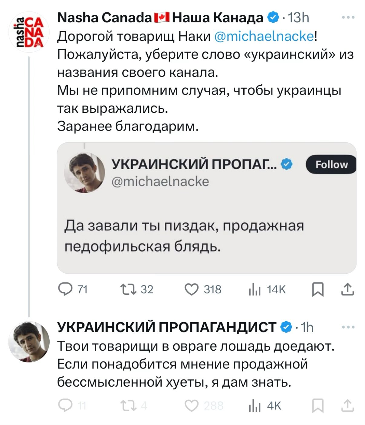 Хуя визг не отдупляющего чушка. В контексте того чью сторону Наки занял, он в топах по полезности от человека в укр. Каждую неделю сборы для бригад всушных. Десятки видео обращений от военных и волонтеров, где они лично Наки благодарят за очередной закрытый сбор.