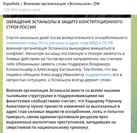 Раньше, если военкор нелестно о нём говорил, то уже через сутки он приносил извинения. Теперь же “Эспаньола” публично требует от него извинений, а z-блогеры это активно репостят. Проблема систем власти по путинскому и кадыровскому типу заключается в том, что если ты демонстрируешь слабость перед своими, то они вполне могут тебя быстро загрызть. И то, что глава Чечни молча терпит, пока его полощут простолюдины, говорит о явном изменении раскладов в российском политическом поле.