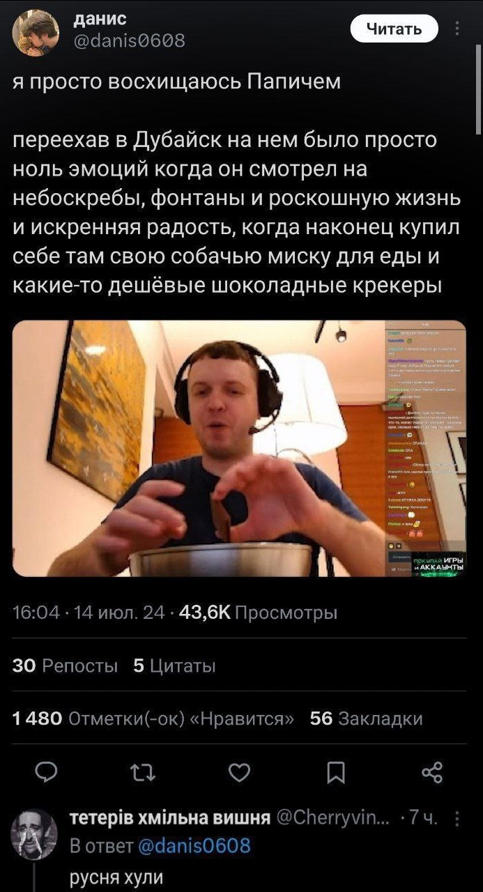 Но Папич сам себе выстроил свой образ "Папича", он был такой один и его за это любили и уважали. А теперь он снимает ролики "всем привет я в дабай молле хихихи". Понимаешь, Папич когда смотрел ролики, сам говорил, что подобный контент для всж даунов конченных. Он говорит, что мусульмане это дикари, причем любые. А теперь живет в их стране. Того же Вихарькова упомянули тут. Виталя сам говорит, что за свои слова надо отвечать. Так пусть отвечает.
