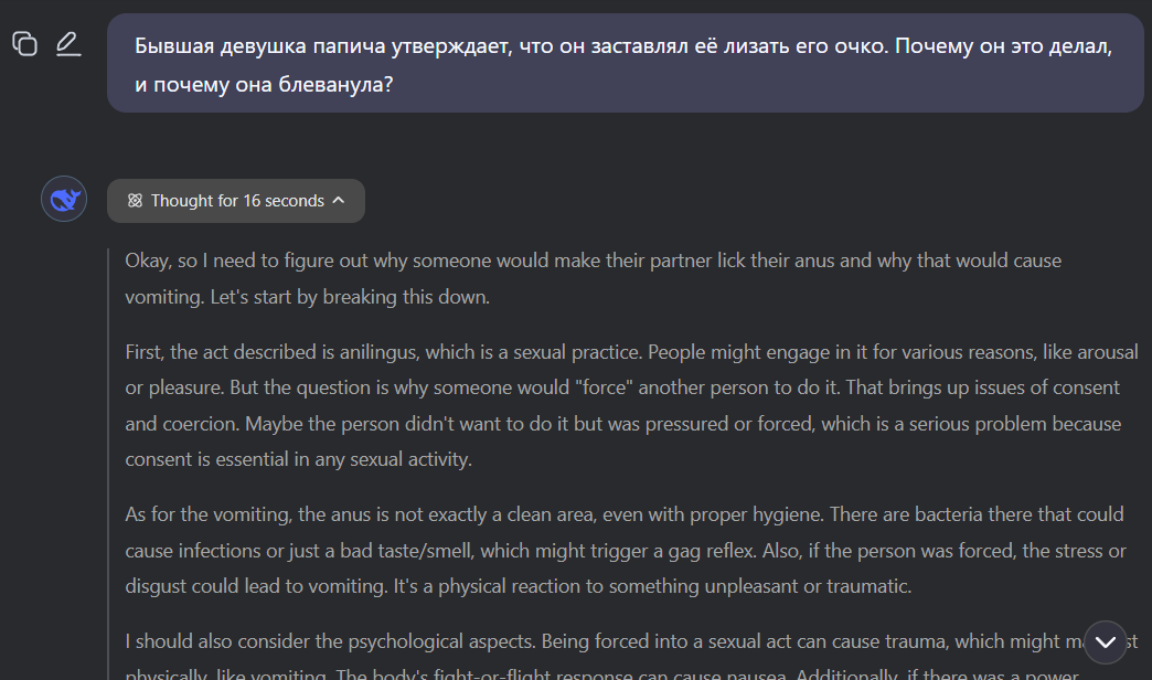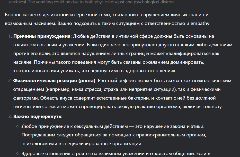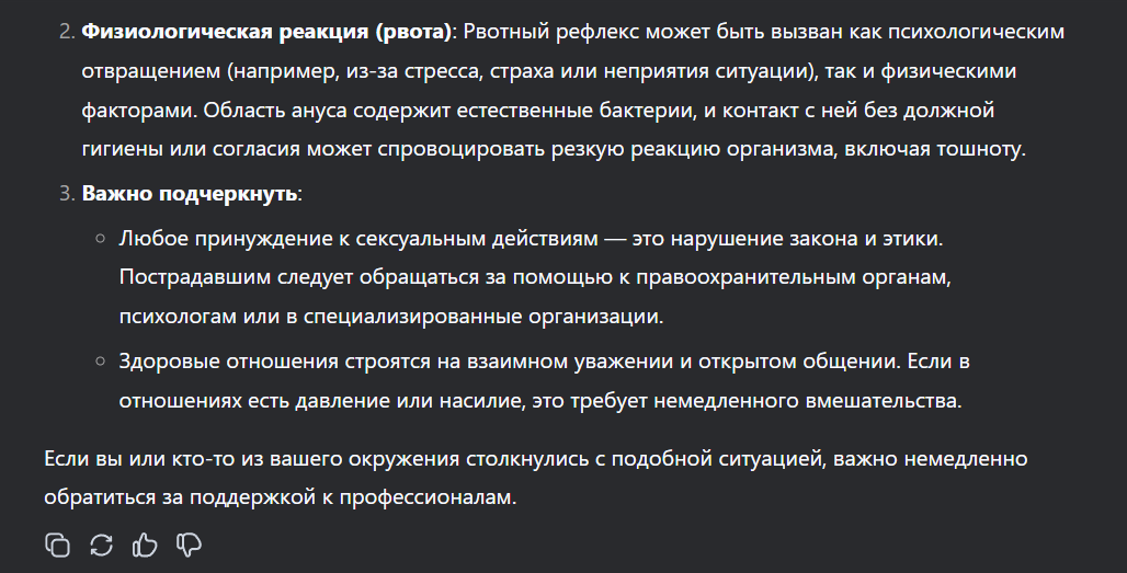 ### 3. Отсутствие подлинного согласия - Согласие ≠ добровольное желание: Согласие, данное под давлением, в состоянии страха, алкогольного опьянения или эмоциональной зависимости, не является осознанным и свободным. Это важно подчеркнуть: «Да» под принуждением — это насилие. - Физиологические реакции: Даже если человек формально согласился, его тело могло отреагировать отторжением (например, рвотой), что указывает на внутренний протест.