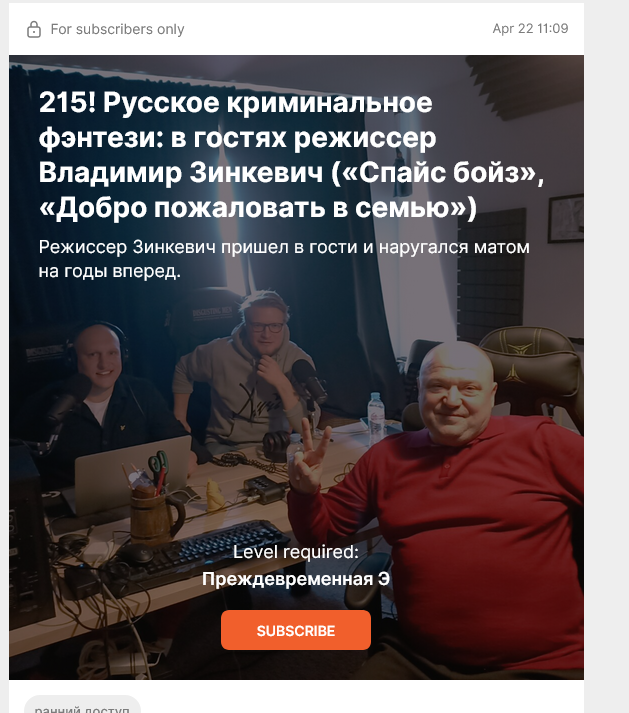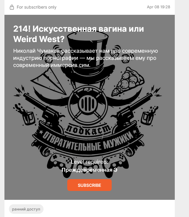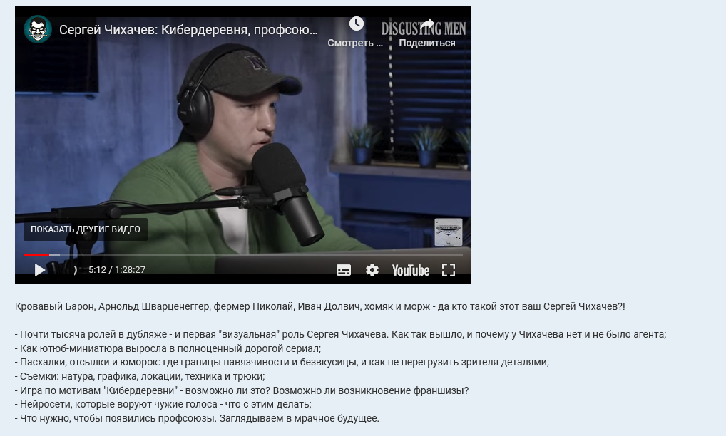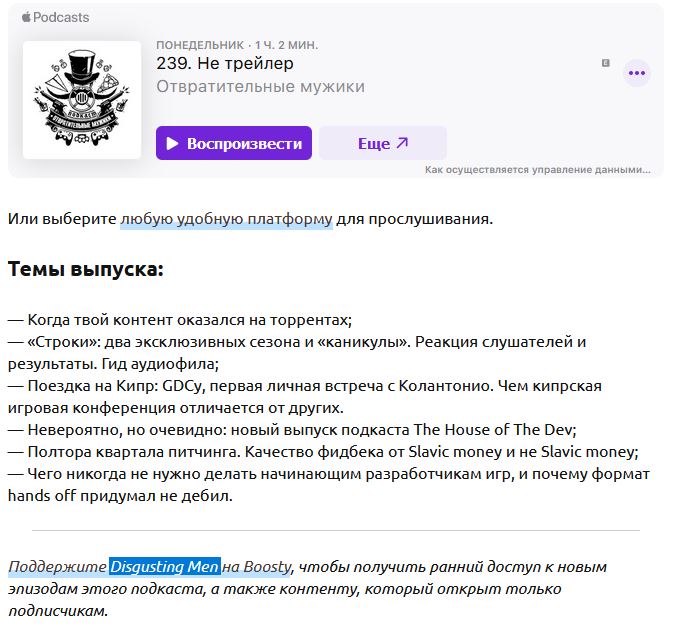 — Литературный призрак выпуска — Владимир Шор: писатель — сломанная нейросеть; — Новая игра про Робокопа уже скоро. Обсуждаем и самого Робокопа, и фильмы, и демо Robocop: Rogue City (которое, к сожалению, уже убрали из Steam); — Super Nintendo в 2023 году: что нового?! — Если бы Супонев говорил об играх то, что действительно думал; — Наш сезон в «Строках»: объясняемся; — Новый альбом «Заточки» — еще один повод поплакать на эскалаторе. — История одной редкой бас-гитары. https://disgustingmen.com/podkasts/luchshe-byt-uzhe-ne-mozhet-podkast-otvratitelnye-muzhiki-235/
