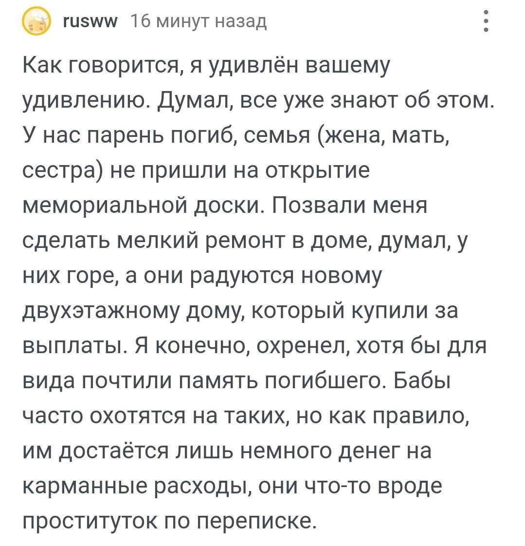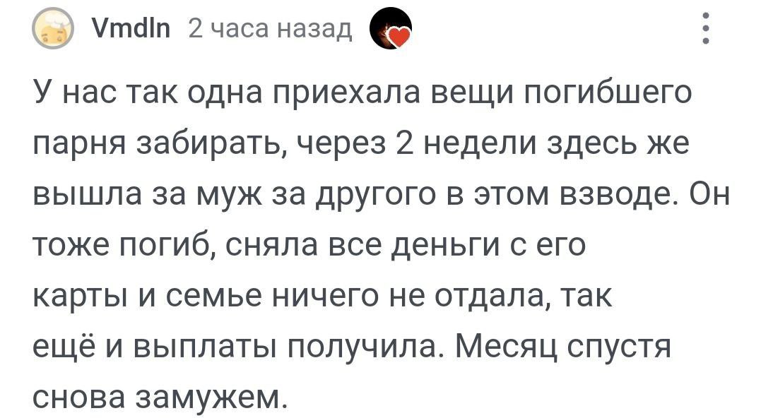 1. Селёдка отправляет воевать сына, мужа, брата, получая за труп хорошую сумму. Самый простой и стандартный кейс. Так что повнимательнее там со своими родственниками. Если такая тема, внезапно исходит от родственников, то лучше валить от них подальше и вычёркивать из своей жизни...