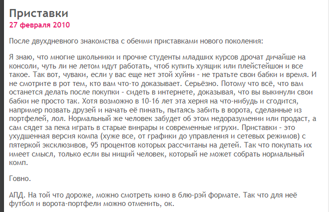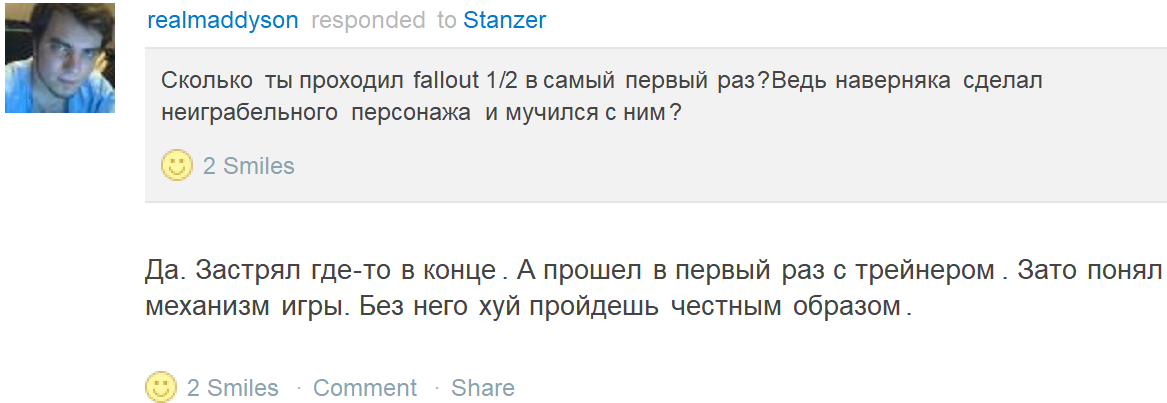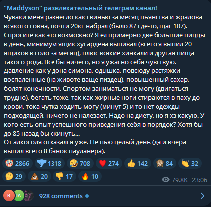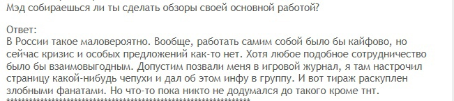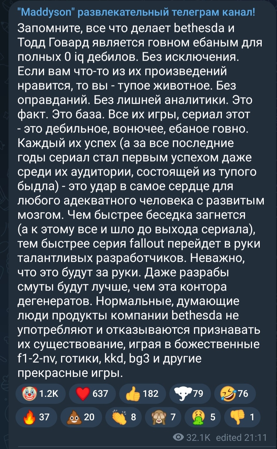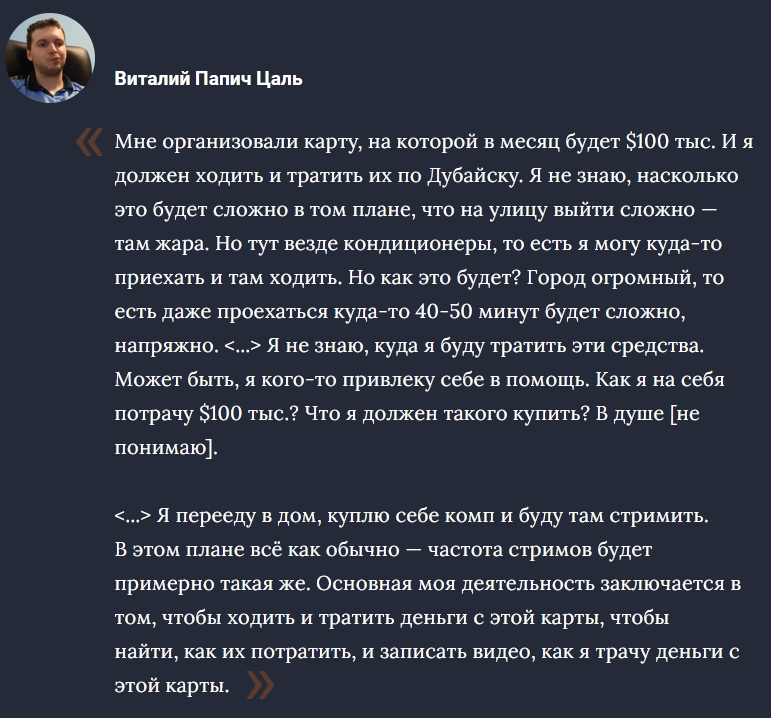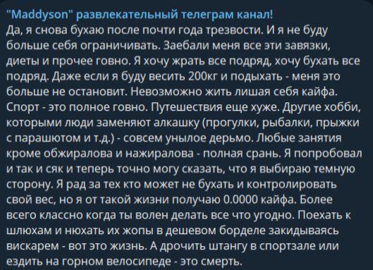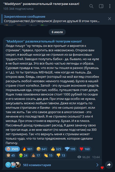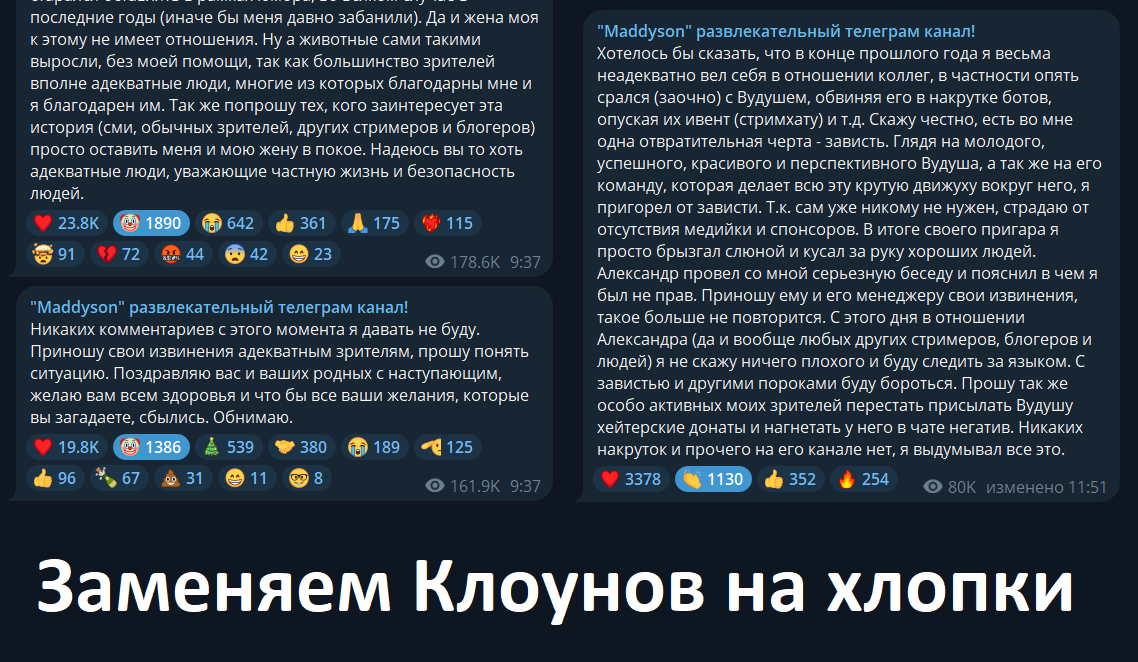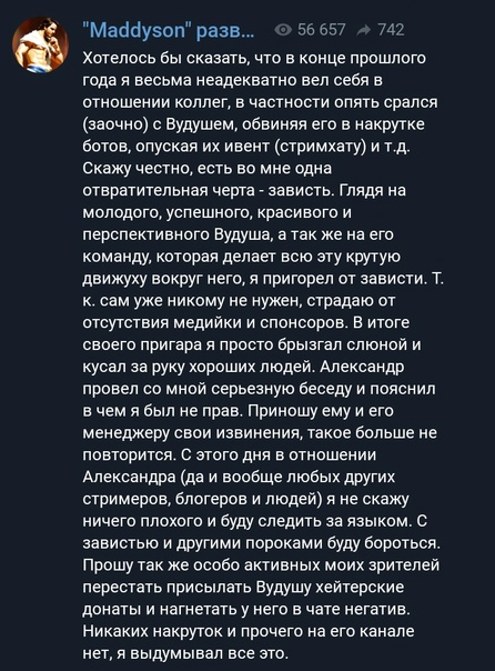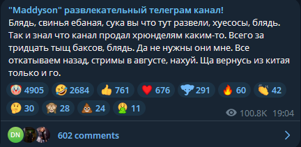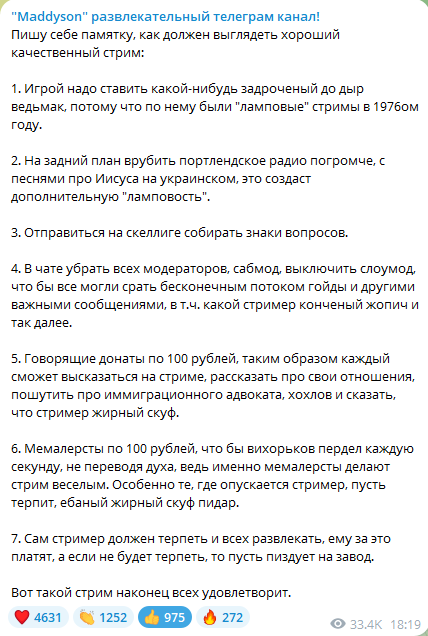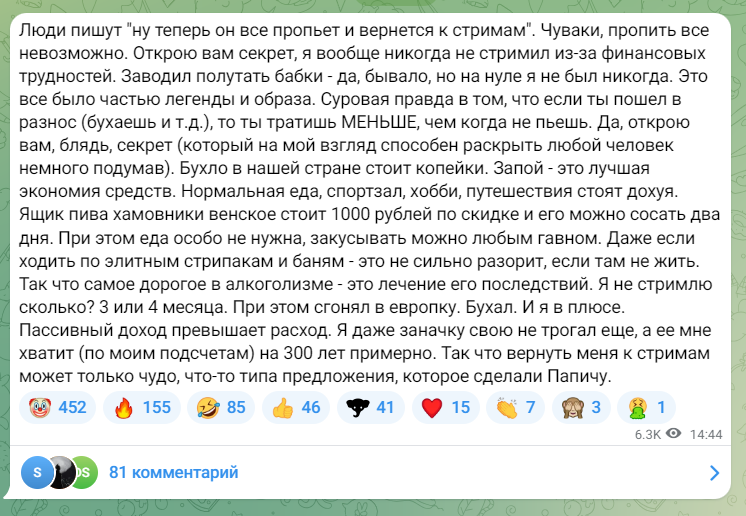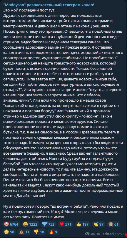 "Ну чего, почитал и что увидел? Очередное нытье, про то, как раньше было лучше, как хорош был марафон по ведьмакам или какие-то каловые видео столетней давности. Парни, я не могу сделать то о чем вы просите. Все эти марафоны ведьмаков они УЖЕ БЫЛИ, как и обзоры на месть боксера. Я не могу сделать это снова, потому что я уже это сделал. Просить меня снова сделать что-то похожее так же тупо, как просить какую-нибудь музыкальную группу написать хит типа того, который у них уже есть. Так что остается признать, я больше не способен на качественный контент, который мог бы удовлетворить столь взыскательную аудиторию! Негатив мне читать надоело, открытый чат с бесконечным спамом всякой хуйни надоел до опиздинения, дебильными донатами и мемалертсами я сыт по горло, как и клоунами в телеге. Думаю в такой ситуации лучше вообще не стримить, чем мучать себя и людей."