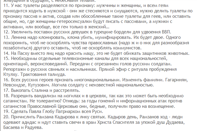 Алсо, чмодьё живёт ебейшими стереотипами, которые либо сам выдумал, либо получил через слухи какие-то. Не удивлюсь, если в его понимании это буквально место, где большая часть населения сидит в ГУЛАГе за анекдот про власть. Забавно тут то, что когда он встречает какой-то реальный пиздец, вроде той истории про зэков, которых без должной организации на остров отправили и они там от охуения начали людоедствовать, то это лишь подогревает его коммифобию. А когда встречает ниприятный для себя факт объективных достижений СССР, то начинает визжать "ВРЁТИ!11", как про те же квартиры, которые он думал что отбирают после смерти владельца назад, лол.