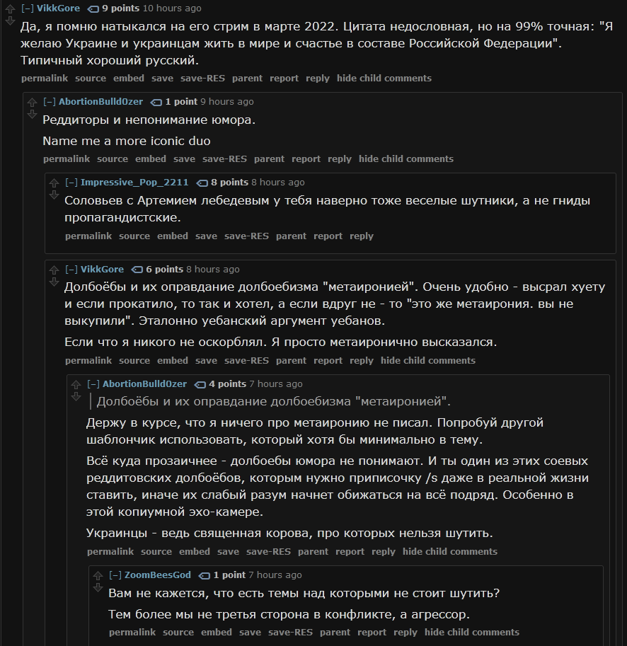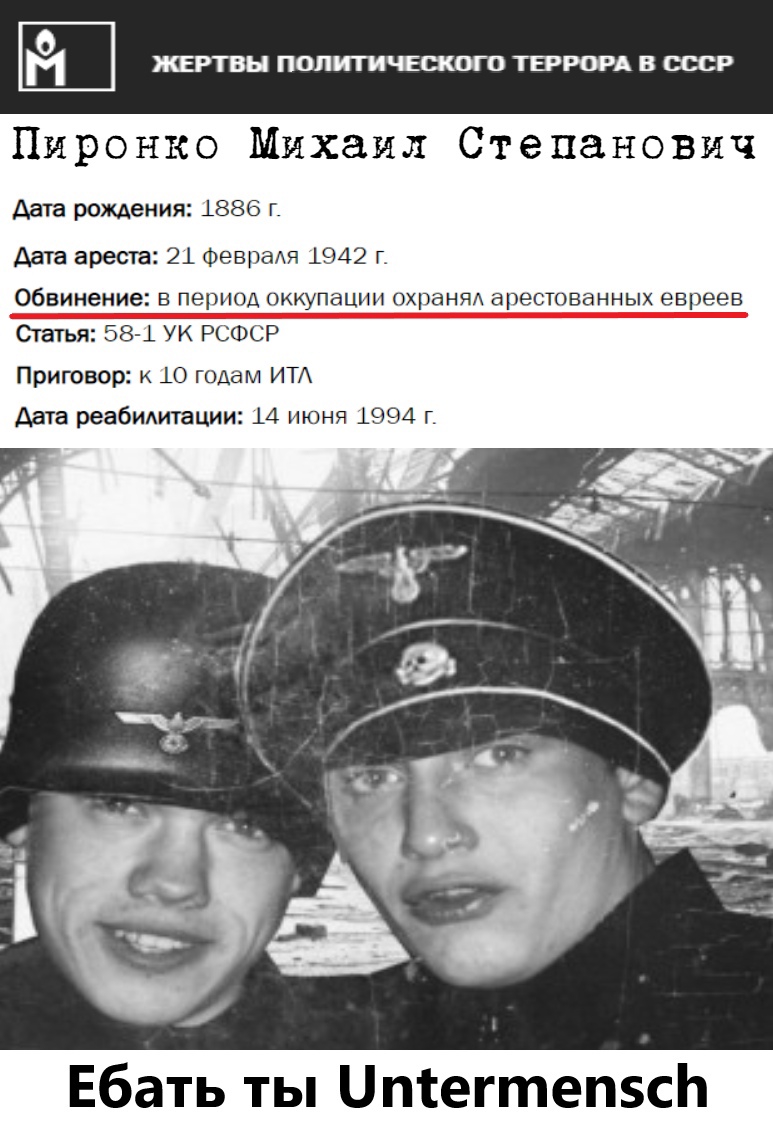 >>849145 >>850220 Я, кста, помню, что он на одном стриме прохождения ГТА5 от первого лица целую речь на серьёзных щах задвинул о том, почему он бы пошёл воевать в РОА, если бы жил во время ВОВ и ему пришлось бы выбирать сторону. Там не обычная чмодьёвская пастырания-клоунада была, а вполне искренние речи. Запросто на реабилитацию нацизма потянет.