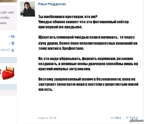 И вообще нахуя мы это в треде чмодья обсуждаем. Жду тебя в очередном треде на /b. Тут не место для таких разговоров.
