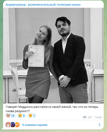 >Когда Ксения и Илья познакомились, он уже был известен в интернете. Мэддисон обладал самым большим каналом на RuTube, который позже был удален. Еще он вел свою авторскую передачу «Игры на вынос», которую транслировал телеканал ТНТ. В последнее время Илья вел трансляции на интернет-портале Twitch, а также стал помощником депутата Государственной Думы. Первая же ссылка.