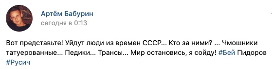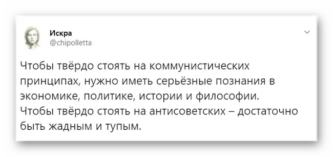 >>902692 >А всякий антисоветчик - всегда гомофоб Значительная часть антисоветчиков - это всякие западники либеральные, они нормально к секс-меньшинствам относятся. А вот среди совков полно гомофобов, в СССР за игры на заднем дворе статья была, и советская психиатрия считала геев больными. И вообще, гомосексуализм - это прерогатива загнивающего капиталистического запада, нам такого в СССР не нужно!