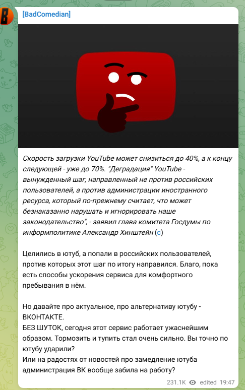 Женя как-то чересчур радикально решил ВК нахуй послать, прям демонстративно заявил что ему пендосский удобный Ютуб дороже Родины ближе и привычнее. Не выйдет ли боком в будущем?