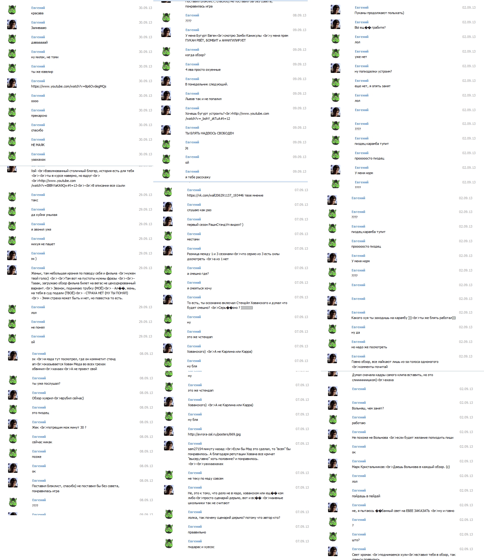 Зато Женя следит за "трендами", в каждом ролике по квоте 10 "актуальных" мЭмОв, чтобы 14 летние даунята хыхыгнули и не заснули при просмотре не дай бог. Вот такая цена "актуальности" - пытаться не искренне подыгрывать пориджам ради классов, 35 летний клоун на сцене, пришел развлекать вас. А уж какой молодец Ностальгирующий критик, который в поисках хоть какого-то контента, начал снимать свои кривляния вообще на всё подряд, лишь бы немножко просмотров собрать. Про АВГН (над которым годами издевается форчан), который будучи "игровым обзорщиком" нихуя не играет в игры, нихуя о них не знает, а добрую четверть (если не больше, не считал) сценариев к его роликам написал его школьный а позже университетский кореш Майк Матей (настоящий энгри и настоящий нерд), а так же записывал геймплей и вообще приносил игры (и даже ПОКУПАЛ их блять) на обзор ему. (И классические обложки к выпускам рисовал тоже он).