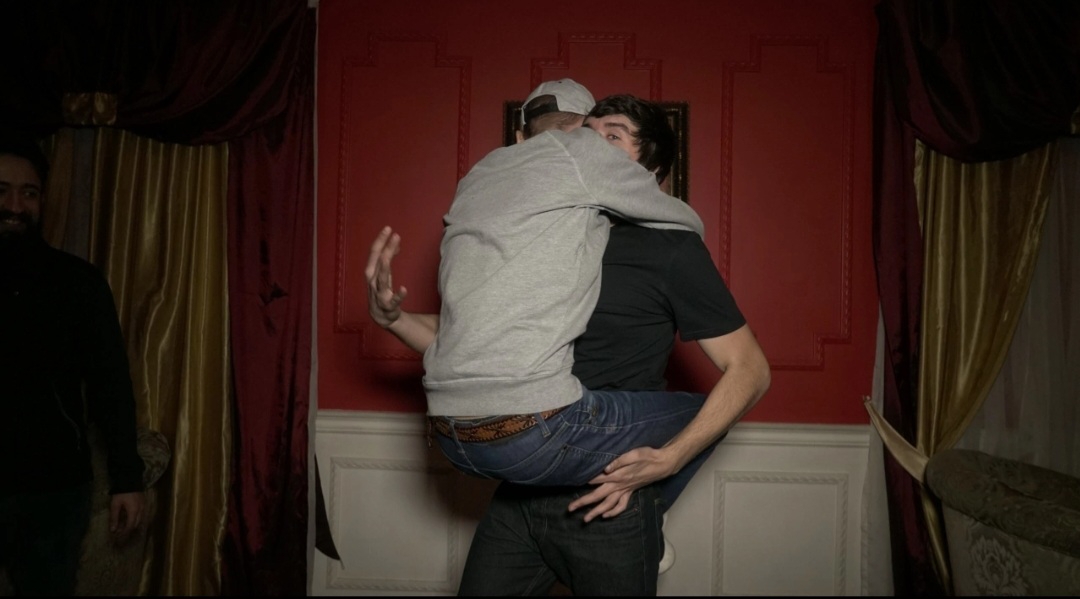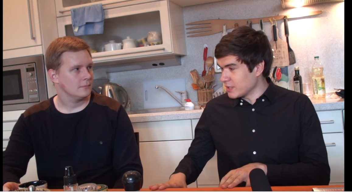 Даже у Шихман в 2021 году он сидит в тёмно-синей рубашке. Синяя футболка, видать, уже истлела к тому времени, или её на Жене порвал один из его любовников. Но что интересно: съемка в порно 2008 года - футболка светло-синяя, интервью 2014 года - футболка синяя, потемнее, интервью 2021 года - тёмно синяя рубашка. Это какой-то тайный знак среди гей-масонов на постсовке? Как у них ложа называется? "Великий розовый анал"?