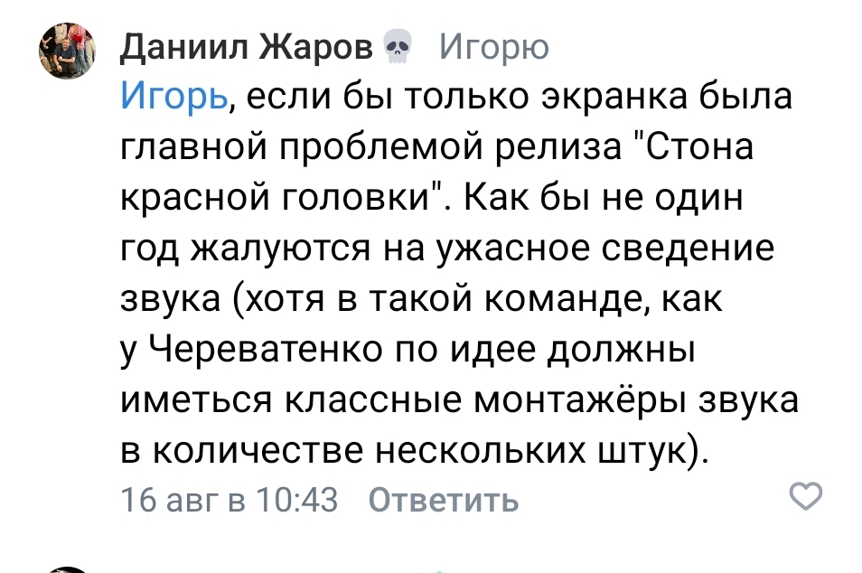 А я вот Конину и ряд обзорщиков смотрю по инерции. Меня они давно не веселят, это просто стало частью моей жизни. Типа, ну я же с пиздючества того же Баженова смотрел, тогда, правда, я угарал с его обзоров фильмов, впрочем я и с обзоров Мэддисона угарал в дикую голосину - сейчас я вообще не помню, чтобы смеялся хоть с одной шутки/скетча у хоть одного кинообзорщика. Разве что Танака неплох, но мне просто его подача заходит, а шутки кажутся просто терпимыми. Такие дела. Думаю, я не один такой в зрилах у Коня, для кого говорящие 30-летние скетчеры - это просто небольшая часть юности.