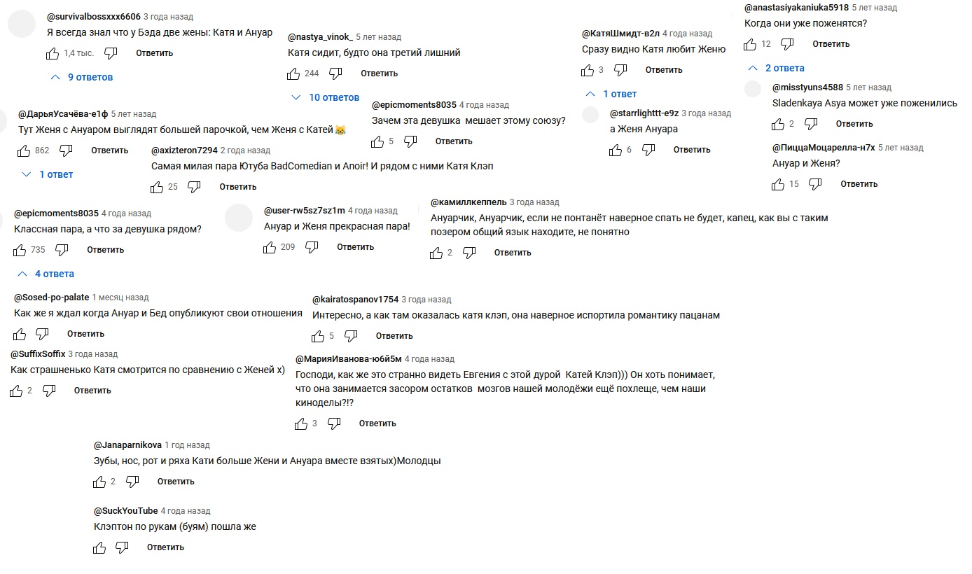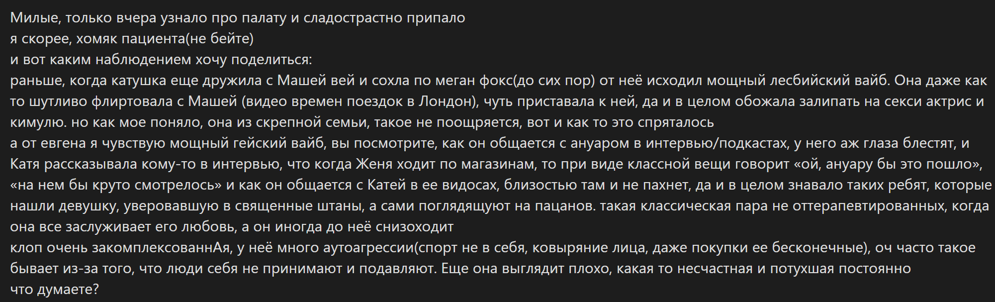 >>902594 В 2017 году Камикадзе Ди был пойман с голым мужиком в одном из своих тогдашних роликов, после чего пошли шутки про гомикадзе-би, ну и повелось считать, что тот гей. В 2021 году помощник Стасяна-какай-просто Егорка Потапенко выложил на ютаб видео, где косвенно обвинял Стасяна в гействе. Что общего между какай-просто и гомикадзе? Угу, бэдконина. С гомикадзе тот дружил в 2011-2015гг, а со Стасяном - в 2018-2021гг, примерно. Причем с ними обоими дружба у Жеки закончилась конфликтным разрывом и неприятным послесловием. Похоже на разрывы между эмоциональными любовниками после больших чувств. Также Жека стал амбассадором гачимучи среди широких слоёв населения, он вылил гей-пропаганды на обычных глубинариев больше, чем всякие радужные блогеры. При этом сам Женя всегда топит за высокие моральные ценности по советскому госту. Также 2. У Жени в обзорах почти нет девушек, их появление очень редко. В основном там у него смазливые мальчики и скуфчики. Тут можно возразить, что это шоубиз и камера любит красивых, но тем не менее - перевес хуемразей в роликах бэда показателен. Также 3. Про Бэда ходили слухи, что он гей в начале десятых. Он сам это отмечал в скрине из вк. Можешь поискать в треде или в прошлом. Слухи 2017г о том, что Жека встречается с Катей оказались правдивыми. Слухи о гействе тоже могли такими оказаться, как минимум, они были. Также 4. В этом посте >>748354 → и рядом с ним фотки с жекиного стенд-ап тура 2017г. Обжиматься с парнями ему явно не противно.