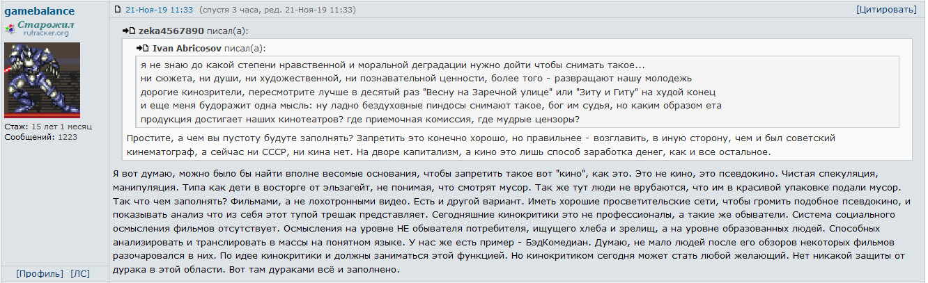 >>908877 Ну да. А что тут обсуждать? Женя сам не развивается (прям как персонажи в обозреваемых им фильмах). Бюджет попилили, сюжет тупой, фильм неисторичен, персонажи не раскрыты, в фильме слишком много аморальности, сейчас все фильмы такие, в Совке снимали лучше, всего плохого. У него все обзоры строятся по одному и тому же шаблону. Всё уже обсудили в первых тредах, теперь тут просто рофлят и иногда срутся, поэтому тут всегда весело :3