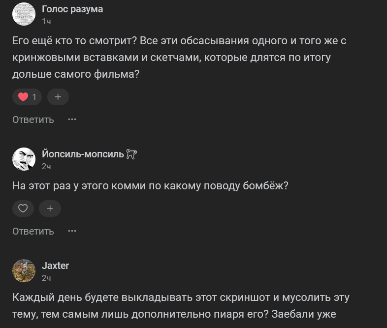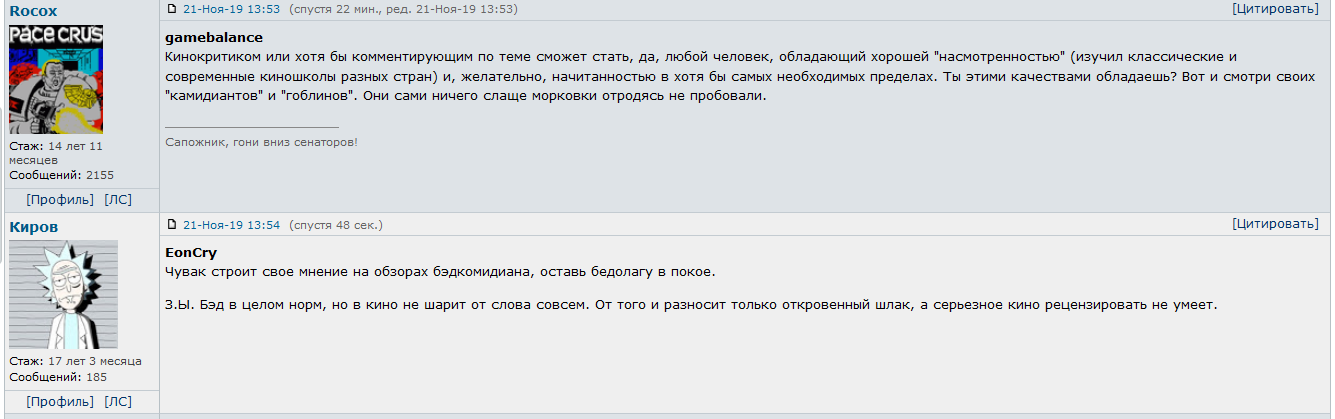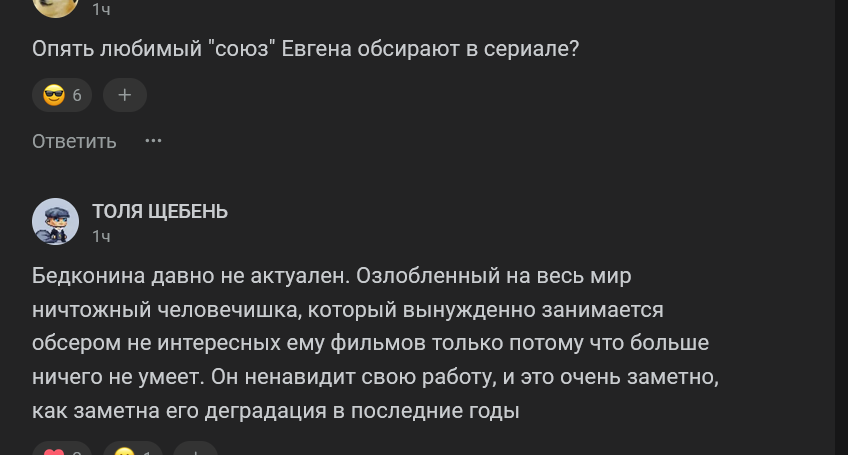 Терл норм обзорщик (особенно позднее, меньше стало пердильных щщюточек), если бы он не пытался в СКЕТЧИ. То, что они хуесосили у Баженова (на эфире с чмаргиналом), оказалось его самым слабым местом. Сначала стоически смотрел эти потуги актёров погорелого театра, думал, ну может, какой-нибудь прикол ввинтит в сюжет обзор, но потом стал тупо скипать. Что характерно, у Баженова эти скетчи ещё более-менее смотрибельные, а вот у гигантов ютуба, как Ностальгирующий критик, это просто несмотрибельно, сразу проскипываешь на обзор. Ещё Better Voice этим грешил в начале, сейчас понял осознал, и этого мусора стало меньше.