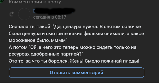 >>978075 >В Совке цензурят буквально ВСЁ - Это норм, такая цензура нужна, благодаря ей культура и всё остальное было на высшем классе >В РФ цензурят интернет - Изверги! Что они себе позволяют? Не дают народу смотреть то, что он хочет, блокируют неугодный контент, вводят цензуру, которая запрещена по Конституции РФ! >В твоём паблике в камментах кто-то из народа указал на противоречие в твоей позиции - Чё, охуел что ли? Я вообще-то правильно всё говорю! Зацензурю... Ой, то есть забаню его