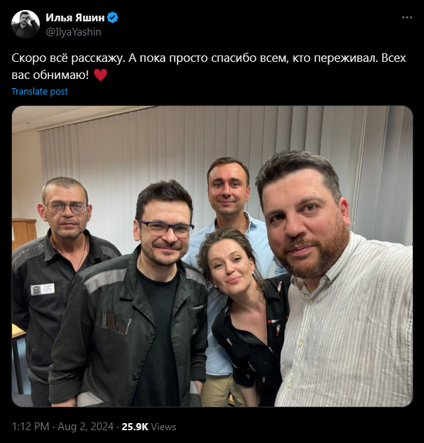 >>927425 По данным СМИ, власти России выдали Владимира Кара-Мурзу, Илью Яшина, Олега Орлова, Андрея Пивоварова, Сашу Скочиленко, Лилию Чанышеву, Ксению Фадееву, Вадима Останина, Кевина Лика, Демури Воронина, Германа Мойжеса, граждан США Пола Уилана, Эвана Гершковича, Алсу Курмашеву, гражданина Германии Патрика Шебеля