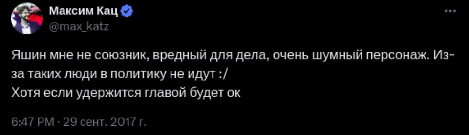 >>925146 а в чем кац не прав?Если бы р. сходила на выборы и проголосовала за люблого кроме путина,то либо он не стал бы президентом,либо нужно было как-то совсем массого фальсифицировать.Каких то радикальных переобувок как у светова у каца не наблюдал,он последовательный либерал а светов непонятно что по взглядам