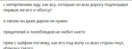 Педофилу даже подсосы из лпр хуев накидали за тейки про 10 детей и любовниц. Он реально не понимает, что такие тейки от 40 летнего бездетного долбоеба, имевшего отношения только с 15 летней малолеткой с фетальным синдромом и крокодилогоблином, читаются жалко?