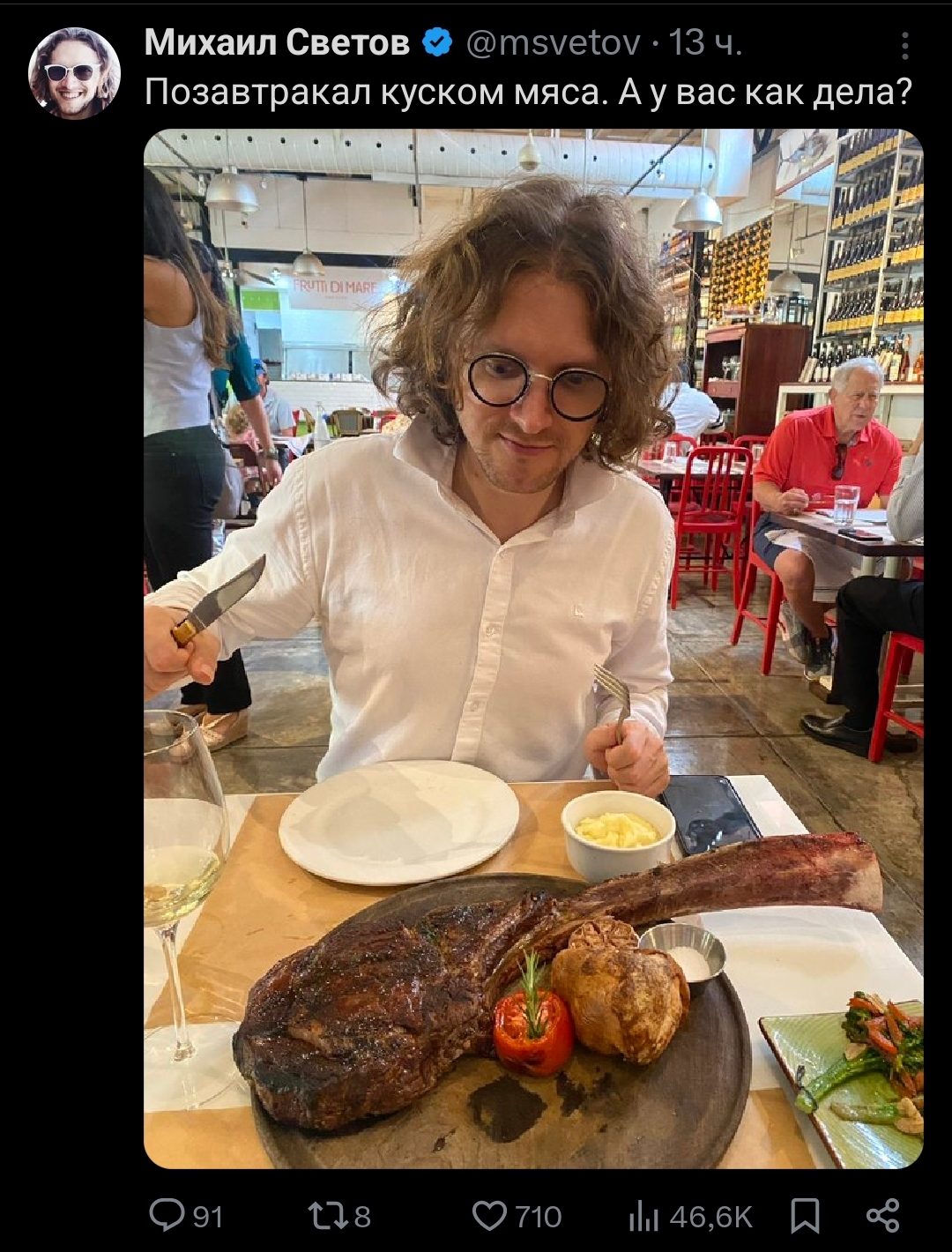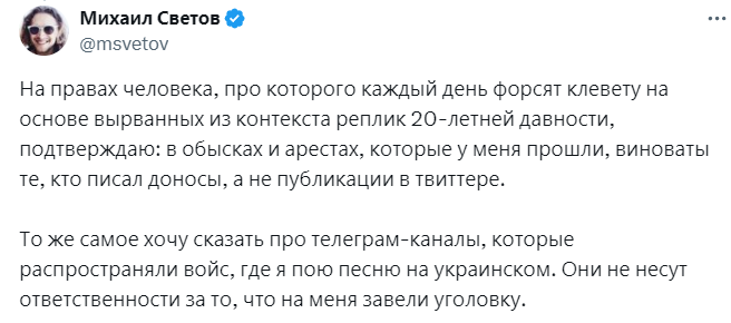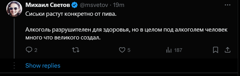 Встаёт Михаил Светов, говорит: — Режу голову... (замолкает) Нет, подождите, дайте сформулирую для начала. Режу голову укрАинцу... Дайте переформулирую, чтобы не вырвали из контекста. (кашляет) Режу голову... (замолкает, думает) Мда, очень некорректно сформулировали условия. Неужели вы не понимаете, что у меня государство отняло бизнес? Я пострадал. У меня БИЗНЕС ОТНЯЛИ, понимаете? Отняли бизнес. Да ещё и кремлеботы и укрАинцы распространяют лживые слухи, будто я педофил. У меня ОТНЯЛИ БИЗНЕС, отняли мой БИЗНЕС. Как вам не стыдно после этого выставлять мне какие-то условия? Государство мне должно. Я хочу получить водку бесплатно, потому что у меня БИЗНЕС ОТНЯЛИ. Поэтому будет справедливо отдать всю водку мне. Я всё должен получать бесплатно, а платить за это пускай будет государство. Хватает бутылку и убегает в Бразилию.