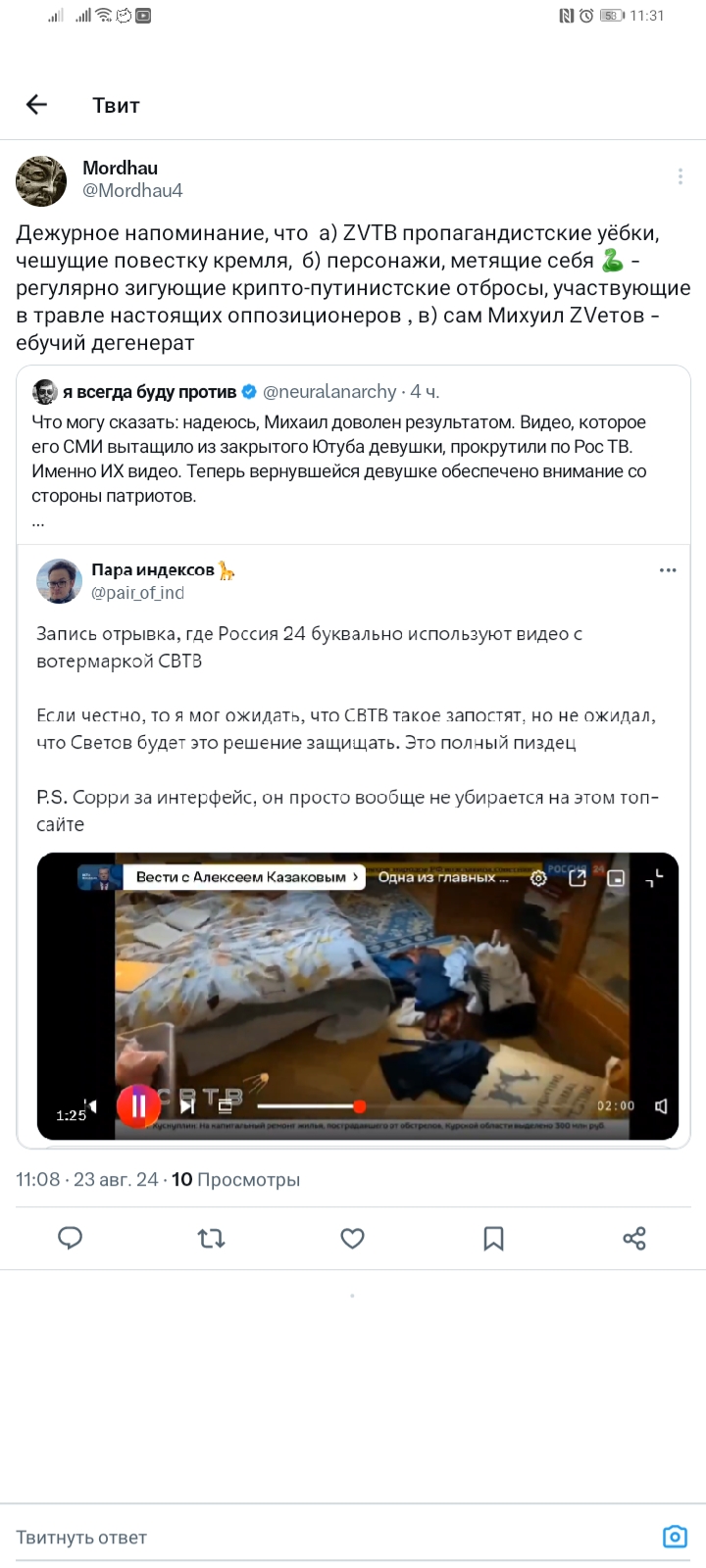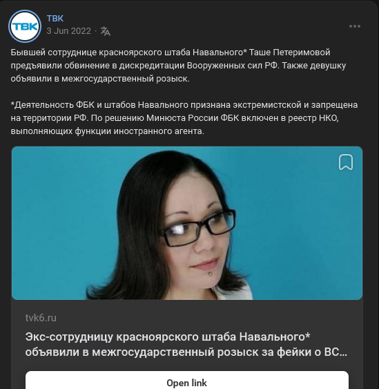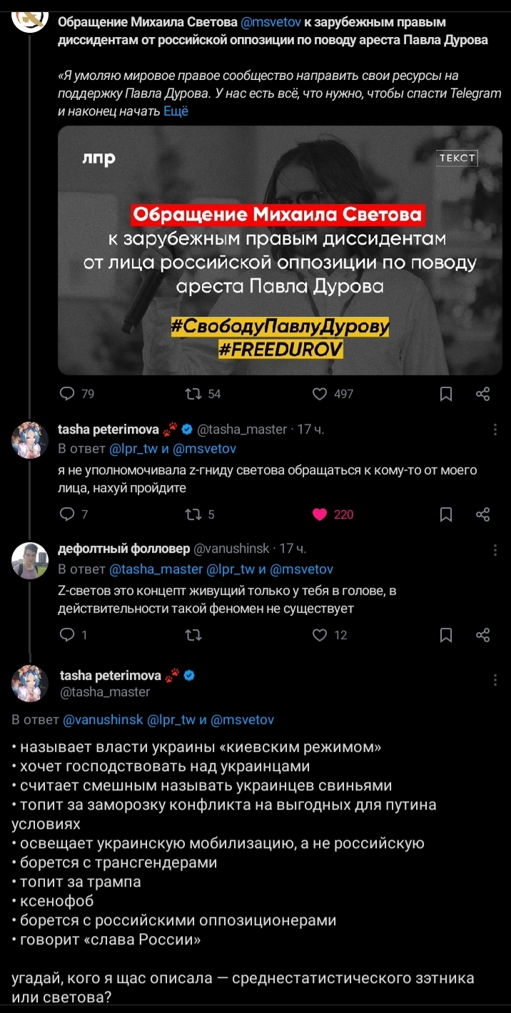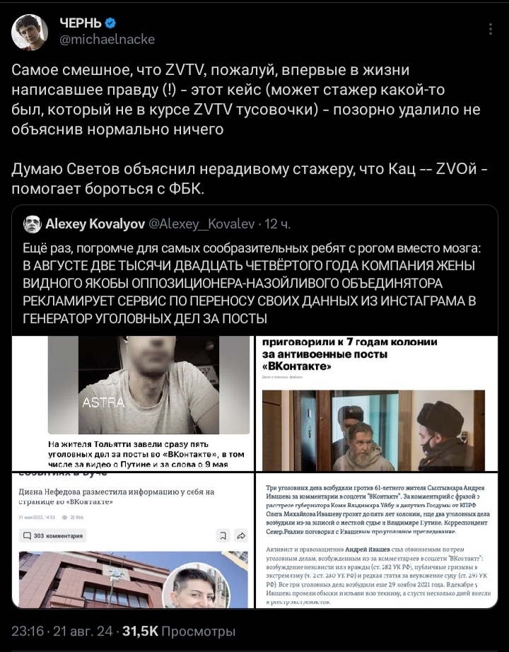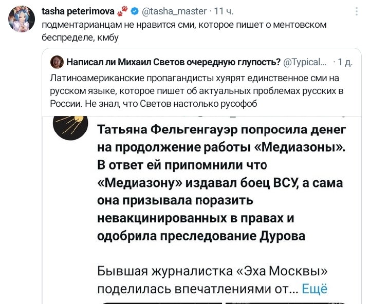 в ватном канале ЗВ ТВ написали, что активистка, которая выступала против войны и Пыни вернулась в РФ в начале года, она удалила все свои видео на ютубе. ЗВ ТВ любезно опубликовали ее старые видео с критикой СВО. Будет забавно, если ее посадят. Хотя, ЗВ ТВ не производит свой контент, Михаил Зветов заявит мы просто эту новость взяли у других!!!.