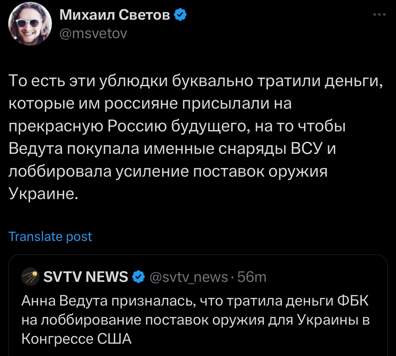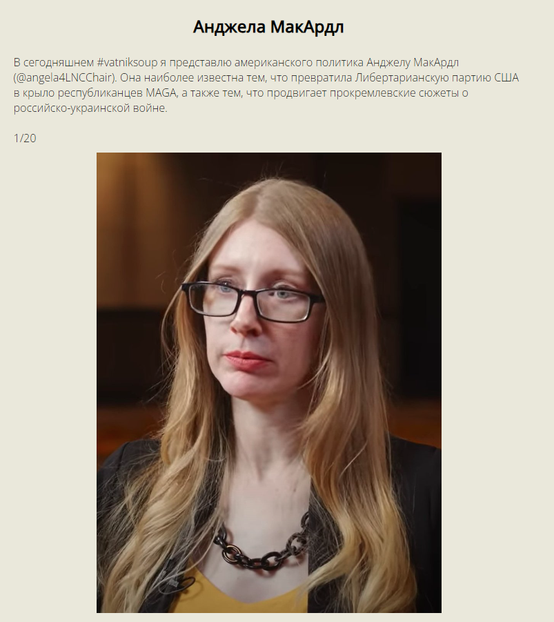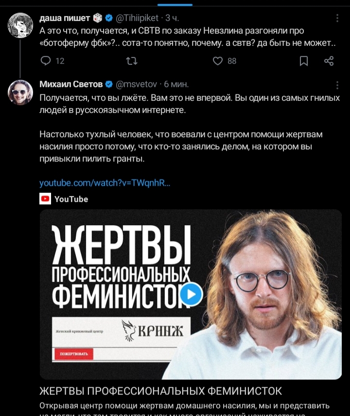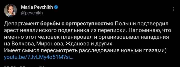 в ватном канале ЗВ ТВ написали, что активистка, которая выступала против войны и Пыни вернулась в РФ в начале года, она удалила все свои видео на ютубе. ЗВ ТВ любезно опубликовали ее старые видео с критикой СВО. Будет забавно, если ее посадят. Хотя, ЗВ ТВ не производит свой контент, Михаил Зветов заявит мы просто эту новость взяли у других!!!.
