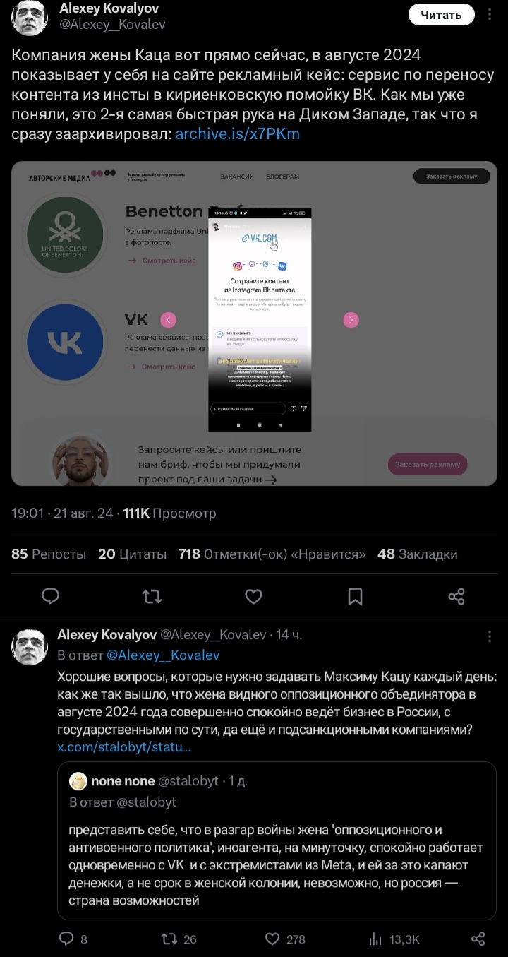 >жена каца оппозиционера держит бизнес в рф и сотрудничает со всякими сберами и вк >неделями этим долбят каца, т.к сам кац выступал против той же апшной вкшечки >19 августа с сайта выпиливается упоминание вк видео, но список блогеров, которых продвигает медиа каца и которые рекламируют сервисы вк, остается >светка раздупляется позже и пишет правду про бизнес жены каца, но т.к лого вк видео выпилено из спонсоров на сайте и не сохранено в вебархиве, дает заднюю, хотя все тоже самое пруфается списком этих самых видеоблогеров