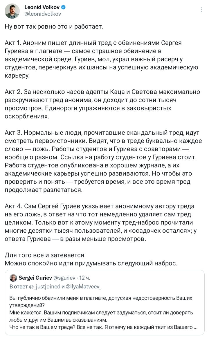 >>936646 >>936644 Тот случай когда человек в репутацией Волкова пытаясь защитить Гуриева только делает ему хуже. Лене давно надо уйти из публичного поля и сконцентрироваться на административной теневой работе.