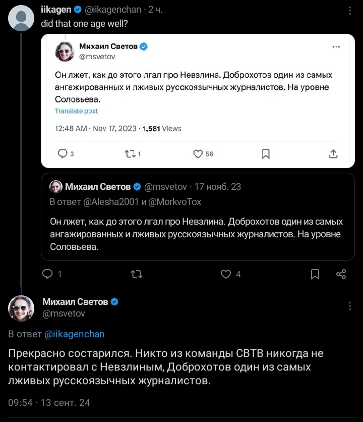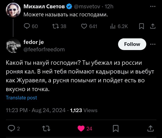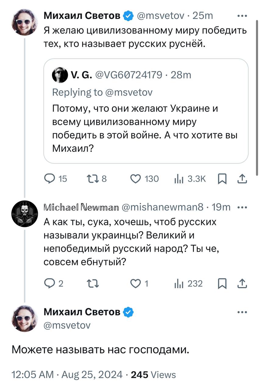 >>937785 Если честно то база, я даже не фанат светова, имею заукраинскую позицию. Но тут чисто база. >>937931 Почему он мразь а хохлы которые сами же у себя спиздили 60 миллиардов долларов мразями не являются.